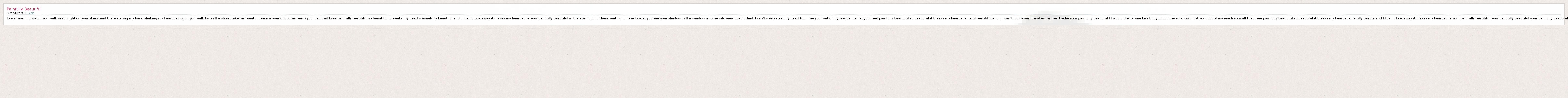 Every morning watch you walk in sunlight on your skin stand there staring my hand shaking my heart caving in you walk by on the street take my breath from me your out of my reach you'll all that I see painfully beautiful so beautiful it breaks my heart shamefully beautiful and I I can't look away it makes my heart ache your painfully beautiful in the evening I'm there waiting for one look at you see your shadow in the window u come into view I can't think I can't sleep steal my heart from me your out of my league I fall at your feet painfully beautiful so beautiful it breaks my heart shameful beautiful and I, I can't look away it makes my heart ache your painfully beautiful I I would die for one kiss but you don't even know I just your out of my reach your all that I see painfully beautiful so beautiful it breaks my heart shamefully beauty and I I can't look away it makes my heart ache your painfully beautiful your painfully beautiful your painfully beautiful