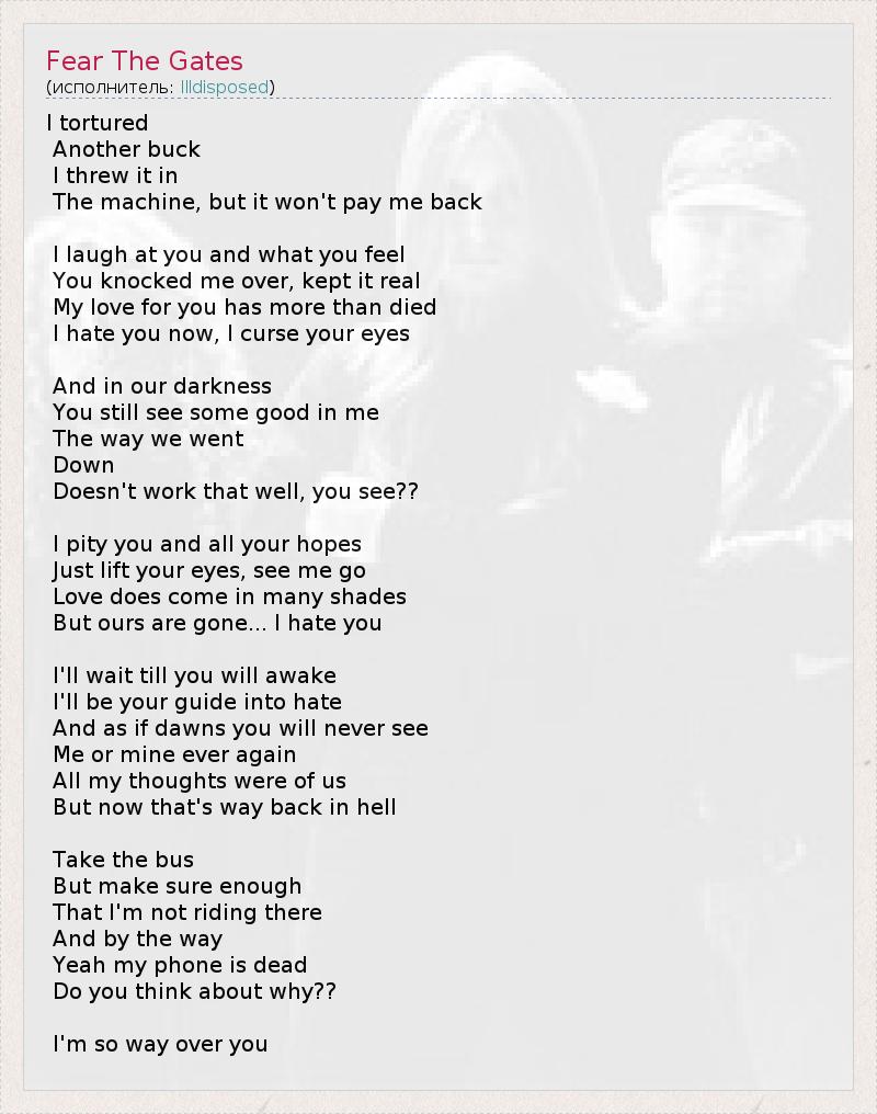 I tortured Another buck I threw it in The machine, but it won't pay me back I laugh at you and what you feel You knocked me over, kept it real My love for you has more than died I hate you now, I curse your eyes And in our darkness You still see some good in me The way we went Down Doesn't work that well, you see?? I pity you and all your hopes Just lift your eyes, see me go Love does come in many shades But ours are gone... I hate you I'll wait till you will awake I'll be your guide into hate And as if dawns you will never see Me or mine ever again All my thoughts were of us But now that's way back in hell Take the bus But make sure enough That I'm not riding there And by the way Yeah my phone is dead Do you think about why?? I'm so way over you