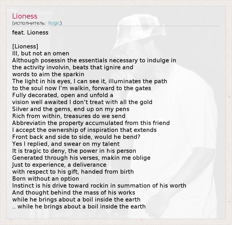 feat. Lioness [Lioness] Ill, but not an omen Although posessin the essentials necessary to indulge in the activity involvin, beats that ignire and words to aim the sparkin The light in his eyes, I can see it, illuminates the path to the soul now I'm walkin, forward to the gates Fully decorated, open and unfold a vision well awaited I don't treat with all the gold Silver and the gems, end up on my pens Rich from within, treasures do we send Abbreviatin the property accumulated from this friend I accept the ownership of inspiration that extends Front back and side to side, would he bend? Yes I replied, and swear on my talent It is tragic to deny, the power in his person Generated through his verses, makin me oblige Just to experience, a deliverance with respect to his gift, handed from birth Born without an option Instinct is his drive toward rockin in summation of his worth And thought behind the mass of his works while he brings about a boil inside the earth .. while he brings about a boil inside the earth