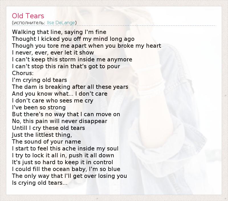 Walking that line, saying I'm fine Thought I kicked you off my mind long ago Though you tore me apart when you broke my heart I never, ever, ever let it show I can't keep this storm inside me anymore I can't stop this rain that's got to pour Chorus: I'm crying old tears The dam is breaking after all these years And you know what... I don't care I don't care who sees me cry I've been so strong But there's no way that I can move on No, this pain will never disappear Untill I cry these old tears Just the littlest thing, The sound of your name I start to feel this ache inside my soul I try to lock it all in, push it all down It's just so hard to keep it in control I could fill the ocean baby, I'm so blue The only way that I'll get over losing you Is crying old tears...