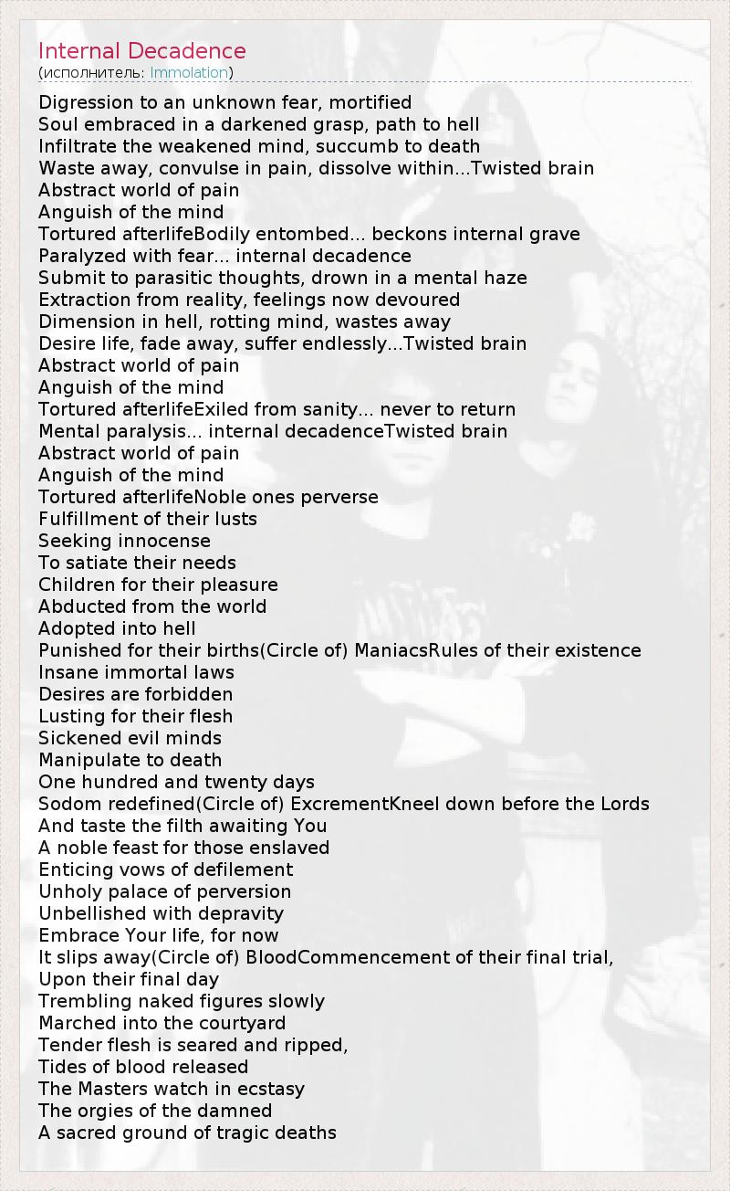 Digression to an unknown fear, mortified Soul embraced in a darkened grasp, path to hell Infiltrate the weakened mind, succumb to death Waste away, convulse in pain, dissolve within...Twisted brain Abstract world of pain Anguish of the mind Tortured afterlifeBodily entombed... beckons internal grave Paralyzed with fear... internal decadence Submit to parasitic thoughts, drown in a mental haze Extraction from reality, feelings now devoured Dimension in hell, rotting mind, wastes away Desire life, fade away, suffer endlessly...Twisted brain Abstract world of pain Anguish of the mind Tortured afterlifeExiled from sanity... never to return Mental paralysis... internal decadenceTwisted brain Abstract world of pain Anguish of the mind Tortured afterlifeNoble ones perverse Fulfillment of their lusts Seeking innocense To satiate their needs Children for their pleasure Abducted from the world Adopted into hell Punished for their births(Circle of) ManiacsRules of their existence Insane immortal laws Desires are forbidden Lusting for their flesh Sickened evil minds Manipulate to death One hundred and twenty days Sodom redefined(Circle of) ExcrementKneel down before the Lords And taste the filth awaiting You A noble feast for those enslaved Enticing vows of defilement Unholy palace of perversion Unbellished with depravity Embrace Your life, for now It slips away(Circle of) BloodCommencement of their final trial, Upon their final day Trembling naked figures slowly Marched into the courtyard Tender flesh is seared and ripped, Tides of blood released The Masters watch in ecstasy The orgies of the damned A sacred ground of tragic deaths