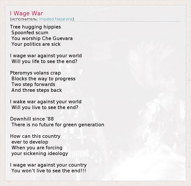 Tree hugging hippies Spoonfed scum You worship Che Guevara Your politics are sick I wage war against your world Will you life to see the end? Pteromys volans crap Blocks the way to progress Two step forwards And three steps back I wake war against your world Will you live to see the end? Downhill since '88 There is no future for green generation How can this country ever to develop When you are forcing your sickening ideology I wage war against your country You won't live to see the end!!!