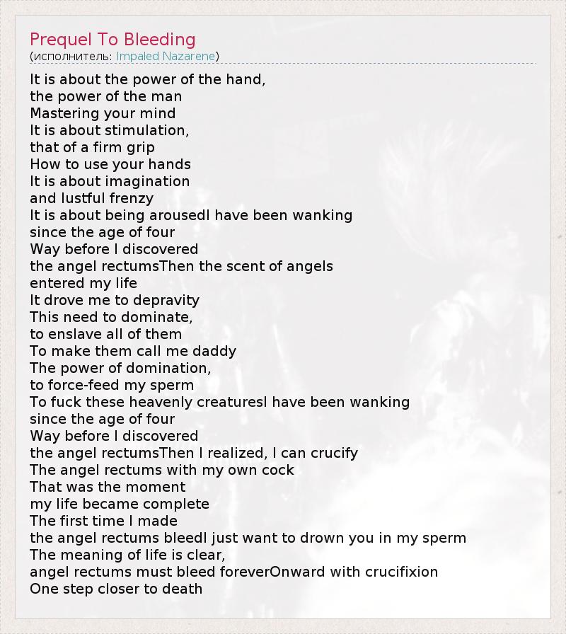 It is about the power of the hand, the power of the man Mastering your mind It is about stimulation, that of a firm grip How to use your hands It is about imagination and lustful frenzy It is about being arousedI have been wanking since the age of four Way before I discovered the angel rectumsThen the scent of angels entered my life It drove me to depravity This need to dominate, to enslave all of them To make them call me daddy The power of domination, to force-feed my sperm To fuck these heavenly creaturesI have been wanking since the age of four Way before I discovered the angel rectumsThen I realized, I can crucify The angel rectums with my own cock That was the moment my life became complete The first time I made the angel rectums bleedI just want to drown you in my sperm The meaning of life is clear, angel rectums must bleed foreverOnward with crucifixion One step closer to death