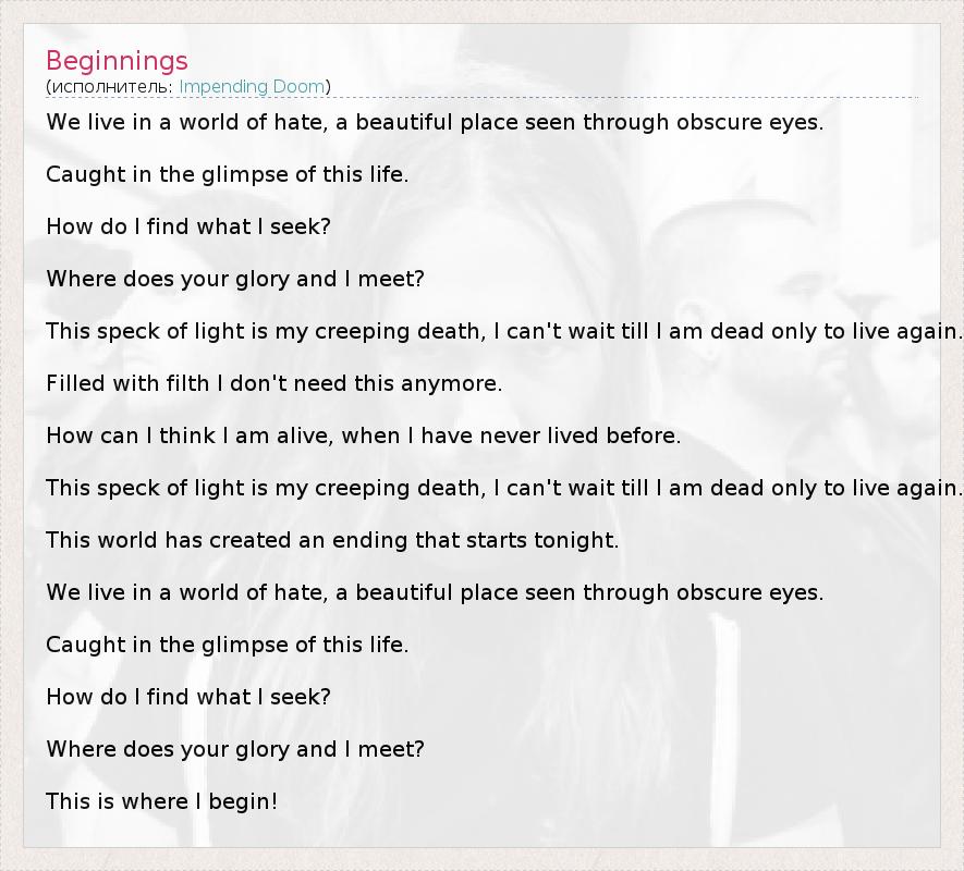 Это интересно:История Impending Doom начинается с 2005-го года, после совместных усилий вокалиста Брука Риверса и гитариста Мэнни Контрераса. В том же году на собственные средства группа записала демо - "The Sin and Doom of Godless Man" при поддержке независимого лейбла IWitness Media.Состав группы довольно часто менялся, и, чаще всего, музыкантам приходилось испытывать дефицит ударников, пока к их составу не присоединился... продолжение
