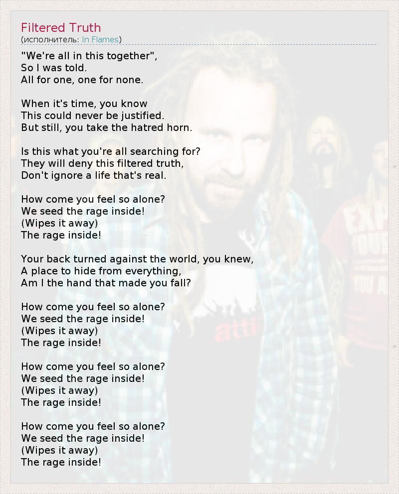 "Мы все в этом виновны", Так мне было сказано. Всё ради себя, но каждый сам по себе. Когда придёт время, вы поймёте, Что это было неоправданно, Но по-прежнему принимаете сигнал ненависти. Неужто вы к этому стремились? Остальные отрекутся от тщательно отобранной правды, Не забывайте, что жизнь реальна. Как так получилось, что вы почувствовали себя такими одинокими? Мы сеем ярость внутри! (Что стирает всё) Ярость внутри! Вы отвёрнуты от мира и знаете это, В месте, где можно спрятаться от всего, Неужели это я заставил вас упасть? Как так получилось, что вы почувствовали себя такими одинокими? Мы сеем ярость внутри! (Что стирает всё) Ярость внутри! Как так получилось, что вы почувствовали себя такими одинокими? Мы сеем ярость внутри! (Что стирает всё) Ярость внутри! Как так получилось, что вы почувствовали себя такими одинокими? Мы сеем ярость внутри! (Что стирает всё) Ярость внутри!