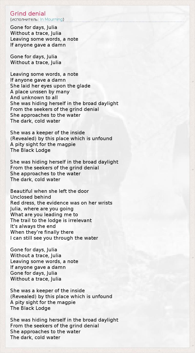 Это интересно:Как одна из лучших новых групп из Швеции за последние годы, In Mourning доказывает, что еще можно писать прогрессивный и мелодичный дэт-метал с оригинальностью и содержательностью. Группа была основана в 2000 году в городе Фалун, Швеция. Имея опыт пяти предыдущих демо, постоянно пишет новый материал, и за последние годы также набирает опыт в живых выступлениях.Их первый альбом Shrouded Divine, вышедший... продолжение