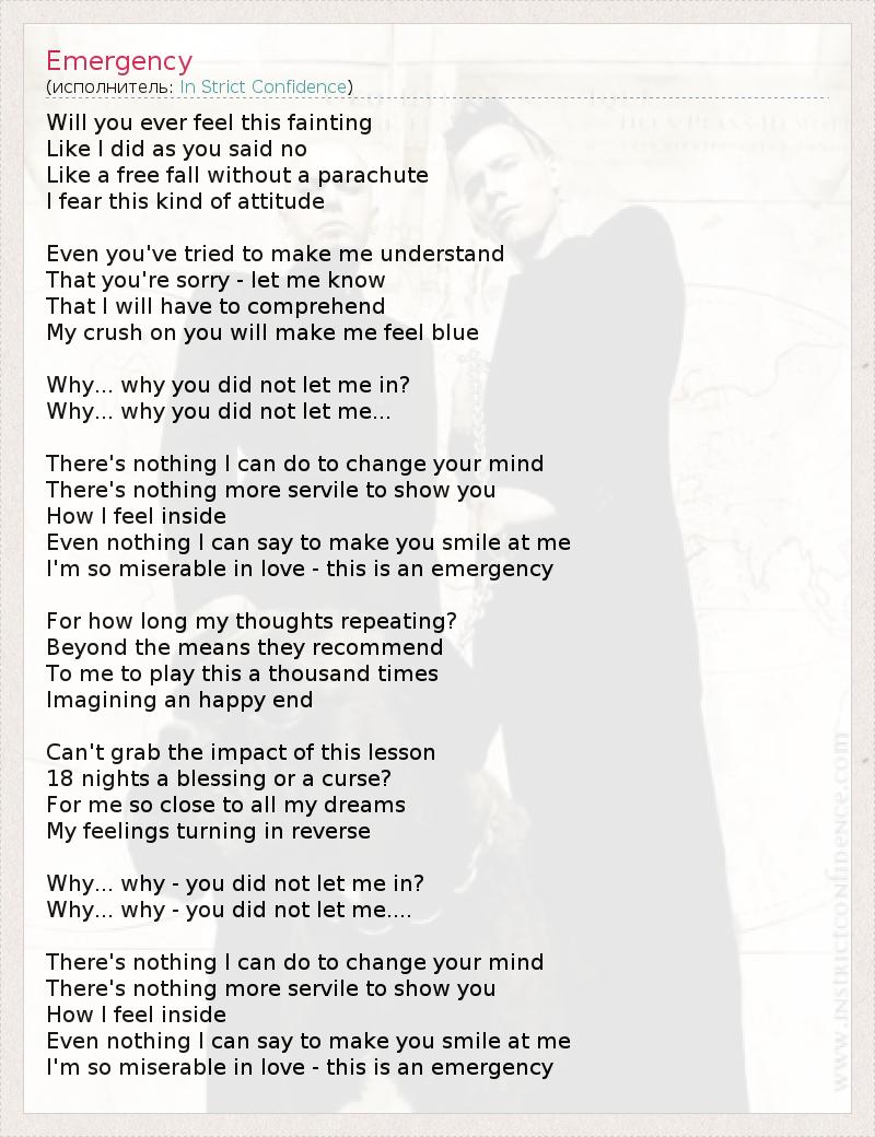 Will you ever feel this fainting Like I did as you said no Like a free fall without a parachute I fear this kind of attitude Even you've tried to make me understand That you're sorry - let me know That I will have to comprehend My crush on you will make me feel blue Why... why you did not let me in? Why... why you did not let me... There's nothing I can do to change your mind There's nothing more servile to show you How I feel inside Even nothing I can say to make you smile at me I'm so miserable in love - this is an emergency For how long my thoughts repeating? Beyond the means they recommend To me to play this a thousand times Imagining an happy end Can't grab the impact of this lesson 18 nights a blessing or a curse? For me so close to all my dreams My feelings turning in reverse Why... why - you did not let me in? Why... why - you did not let me.... There's nothing I can do to change your mind There's nothing more servile to show you How I feel inside Even nothing I can say to make you smile at me I'm so miserable in love - this is an emergency