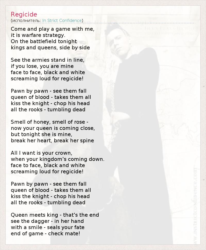 Come and play a game with me, it is warfare strategy. Оn the battlefield tonight kings and queens, side by side See the armies stand in line, if you lose, you are mine face to face, black and white screaming loud for regicide! Pawn by pawn - see them fall queen of blood - takes them all kiss the knight - chop his head all the rooks - tumbling dead Smell of honey, smell of rose - now your queen is coming close, but tonight she is mine, break her heart, break her spine All I want is your crown, when your kingdom's coming down. face to face, black and white screaming loud for regicide! Pawn by pawn - see them fall queen of blood - takes them all kiss the knight - chop his head all the rooks - tumbling dead Queen meets king - that's the end see the dagger - in her hand with a smile - seals your fate end of game - check mate!