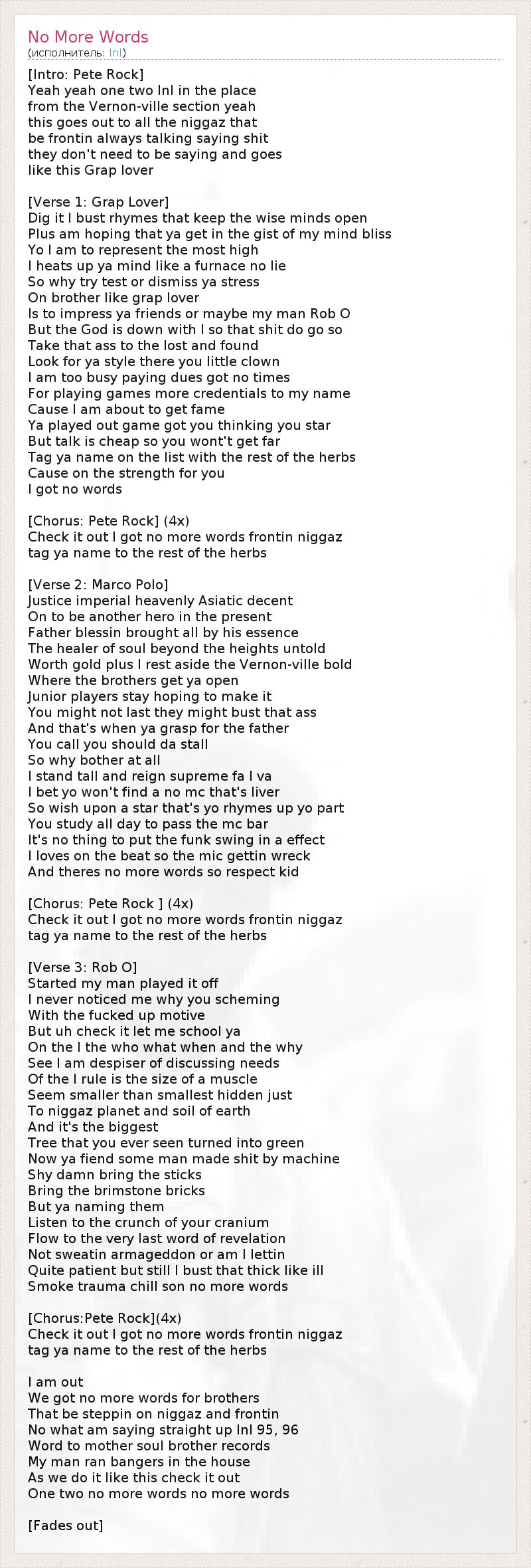 Check it out I got no more words frontin niggaz
