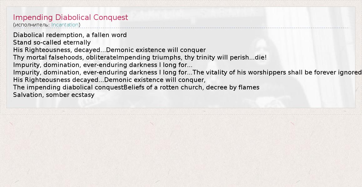 ГлавнаяИсполнителиIncantationImpending Diabolical Conquest