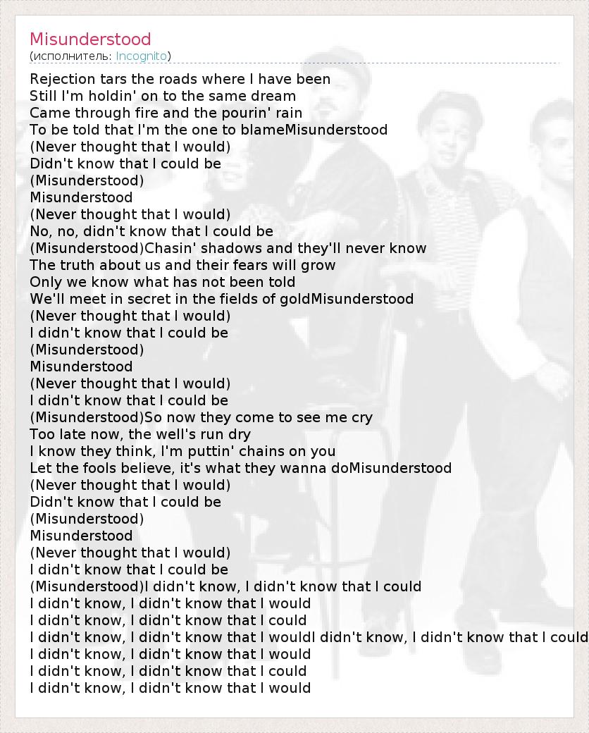 Rejection tars the roads where I have been Still I'm holdin' on to the same dream Came through fire and the pourin' rain To be told that I'm the one to blameMisunderstood (Never thought that I would) Didn't know that I could be (Misunderstood) Misunderstood (Never thought that I would) No, no, didn't know that I could be (Misunderstood)Chasin' shadows and they'll never know The truth about us and their fears will grow Only we know what has not been told We'll meet in secret in the fields of goldMisunderstood (Never thought that I would) I didn't know that I could be (Misunderstood) Misunderstood (Never thought that I would) I didn't know that I could be (Misunderstood)So now they come to see me cry Too late now, the well's run dry I know they think, I'm puttin' chains on you Let the fools believe, it's what they wanna doMisunderstood (Never thought that I would) Didn't know that I could be (Misunderstood) Misunderstood (Never thought that I would) I didn't know that I could be (Misunderstood)I didn't know, I didn't know that I could I didn't know, I didn't know that I would I didn't know, I didn't know that I could I didn't know, I didn't know that I wouldI didn't know, I didn't know that I could I didn't know, I didn't know that I would I didn't know, I didn't know that I could I didn't know, I didn't know that I would