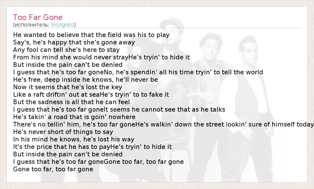 А как ты думаешь, о чем песня "Too Far Gone" ?