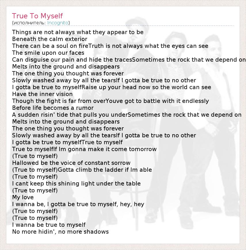 Things are not always what they appear to be Beneath the calm exterior There can be a soul on fireTruth is not always what the eyes can see The smile upon our faces Can disguise our pain and hide the tracesSometimes the rock that we depend on Melts into the ground and disappears The one thing you thought was forever Slowly washed away by all the tearsIf I gotta be true to no other I gotta be true to myselfRaise up your head now so the world can see Have the inner vision Though the fight is far from overYouve got to battle with it endlessly Before life becomes a rumor A sudden risin' tide that pulls you underSometimes the rock that we depend on Melts into the ground and disappears The one thing you thought was forever Slowly washed away by all the tearsIf I gotta be true to no other I gotta be true to myselfTrue to myself True to myselfIf Im gonna make it come tomorrow (True to myself) Hallowed be the voice of constant sorrow (True to myself)Gotta climb the ladder if Im able (True to myself) I cant keep this shining light under the table (True to myself) My love I wanna be, I gotta be true to myself, hey, hey (True to myself) (True to myself) I wanna be true to myself No more hidin', no more shadows