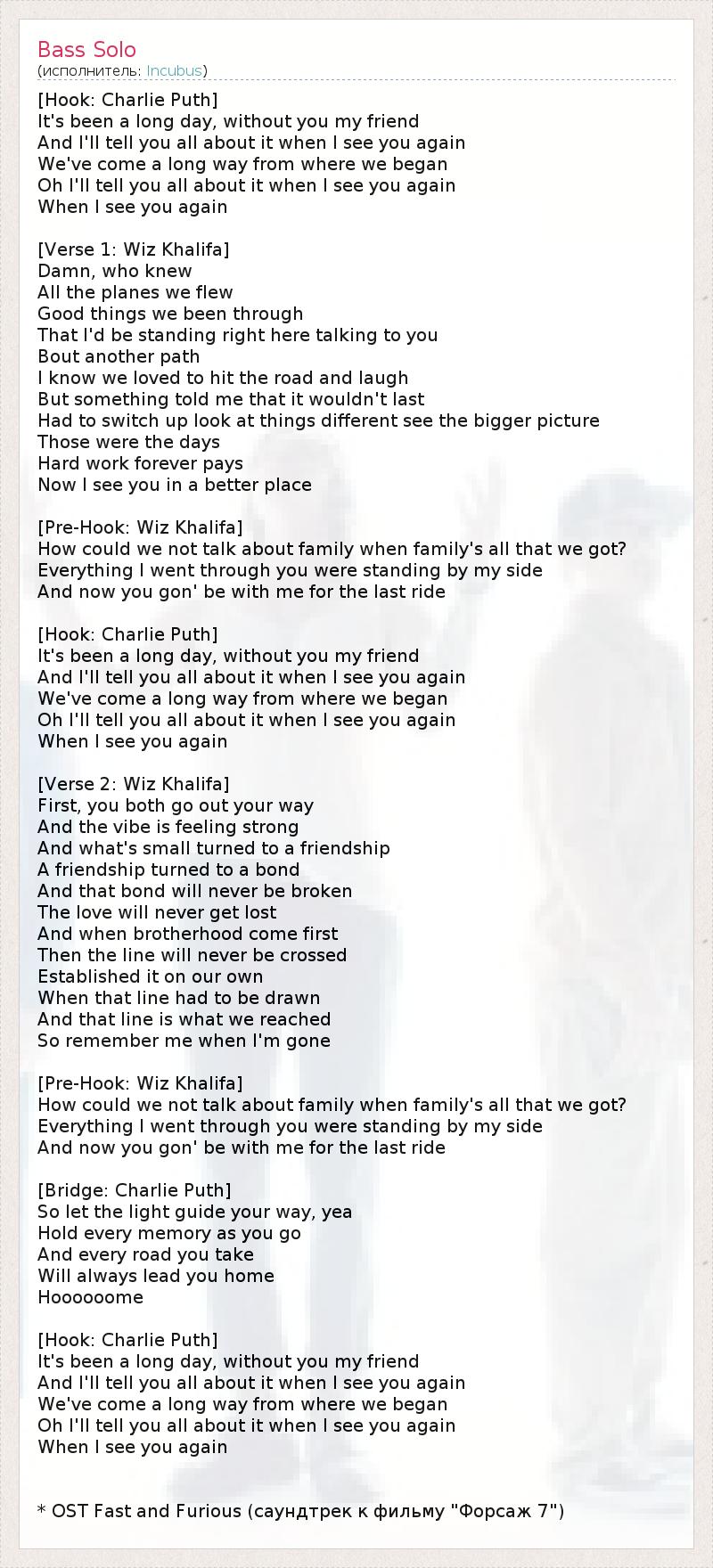 [Hook: Charlie Puth] It's been a long day, without you my friend And I'll tell you all about it when I see you again We've come a long way from where we began Oh I'll tell you all about it when I see you again When I see you again [Verse 1: Wiz Khalifa] Damn, who knew All the planes we flew Good things we been through That I'd be standing right here talking to you Bout another path I know we loved to hit the road and laugh But something told me that it wouldn't last Had to switch up look at things different see the bigger picture Those were the days Hard work forever pays Now I see you in a better place [Pre-Hook: Wiz Khalifa] How could we not talk about family when family's all that we got? Everything I went through you were standing by my side And now you gon' be with me for the last ride [Hook: Charlie Puth] It's been a long day, without you my friend And I'll tell you all about it when I see you again We've come a long way from where we began Oh I'll tell you all about it when I see you again When I see you again [Verse 2: Wiz Khalifa] First, you both go out your way And the vibe is feeling strong And what's small turned to a friendship A friendship turned to a bond And that bond will never be broken The love will never get lost And when brotherhood come first Then the line will never be crossed Established it on our own When that line had to be drawn And that line is what we reached So remember me when I'm gone [Pre-Hook: Wiz Khalifa] How could we not talk about family when family's all that we got? Everything I went through you were standing by my side And now you gon' be with me for the last ride [Bridge: Charlie Puth] So let the light guide your way, yea Hold every memory as you go And every road you take Will always lead you home Hoooooome [Hook: Charlie Puth] It's been a long day, without you my friend And I'll tell you all about it when I see you again We've come a long way from where we began Oh I'll tell you all about it when I see you again When I see you again * OST Fast and Furious (саундтрек к фильму "Форсаж 7")