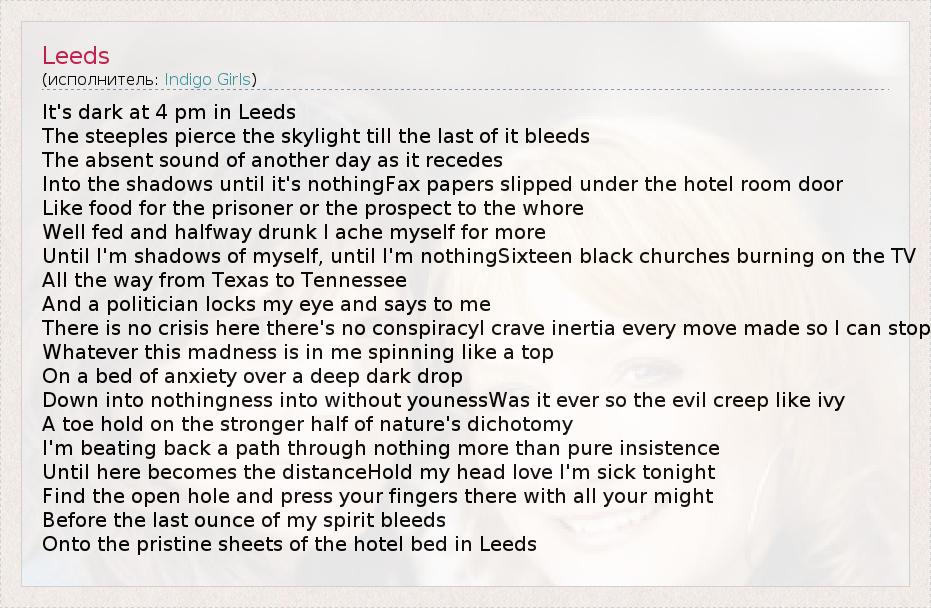 Это интересно:Indigo Girls это Amy Ray и Emily Saliers. Они встретились на игровой площадке начальной школы в Дэкетуре, штат Джоржия и выступают вместе со школы. Они записались на Epic Records в 1989 и получили грэмми за лучшее фолк-альбом в том же году (за одноимённый релиз). Их хитами были такие песни, как "Galileo", "Closer... продолжение