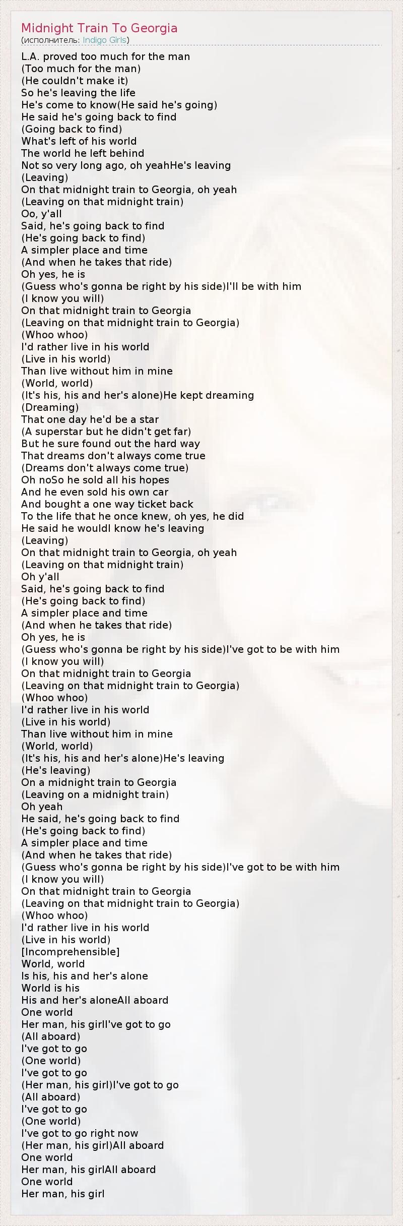 L.A. proved too much for the man (Too much for the man) (He couldn't make it) So he's leaving the life He's come to know(He said he's going) He said he's going back to find (Going back to find) What's left of his world The world he left behind Not so very long ago, oh yeahHe's leaving (Leaving) On that midnight train to Georgia, oh yeah (Leaving on that midnight train) Oo, y'all Said, he's going back to find (He's going back to find) A simpler place and time (And when he takes that ride) Oh yes, he is (Guess who's gonna be right by his side)I'll be with him (I know you will) On that midnight train to Georgia (Leaving on that midnight train to Georgia) (Whoo whoo) I'd rather live in his world (Live in his world) Than live without him in mine (World, world) (It's his, his and her's alone)He kept dreaming (Dreaming) That one day he'd be a star (A superstar but he didn't get far) But he sure found out the hard way That dreams don't always come true (Dreams don't always come true) Oh noSo he sold all his hopes And he even sold his own car And bought a one way ticket back To the life that he once knew, oh yes, he did He said he wouldI know he's leaving (Leaving) On that midnight train to Georgia, oh yeah (Leaving on that midnight train) Oh y'all Said, he's going back to find (He's going back to find) A simpler place and time (And when he takes that ride) Oh yes, he is (Guess who's gonna be right by his side)I've got to be with him (I know you will) On that midnight train to Georgia (Leaving on that midnight train to Georgia) (Whoo whoo) I'd rather live in his world (Live in his world) Than live without him in mine (World, world) (It's his, his and her's alone)He's leaving (He's leaving) On a midnight train to Georgia (Leaving on a midnight train) Oh yeah He said, he's going back to find (He's going back to find) A simpler place and time (And when he takes that ride) (Guess who's gonna be right by his side)I've got to be with him (I know you will) On that midnight train to Georgia (Leaving on that midnight train to Georgia) (Whoo whoo) I'd rather live in his world (Live in his world) [Incomprehensible] World, world Is his, his and her's alone World is his His and her's aloneAll aboard One world Her man, his girlI've got to go (All aboard) I've got to go (One world) I've got to go (Her man, his girl)I've got to go (All aboard) I've got to go (One world) I've got to go right now (Her man, his girl)All aboard One world Her man, his girlAll aboard One world Her man, his girl
