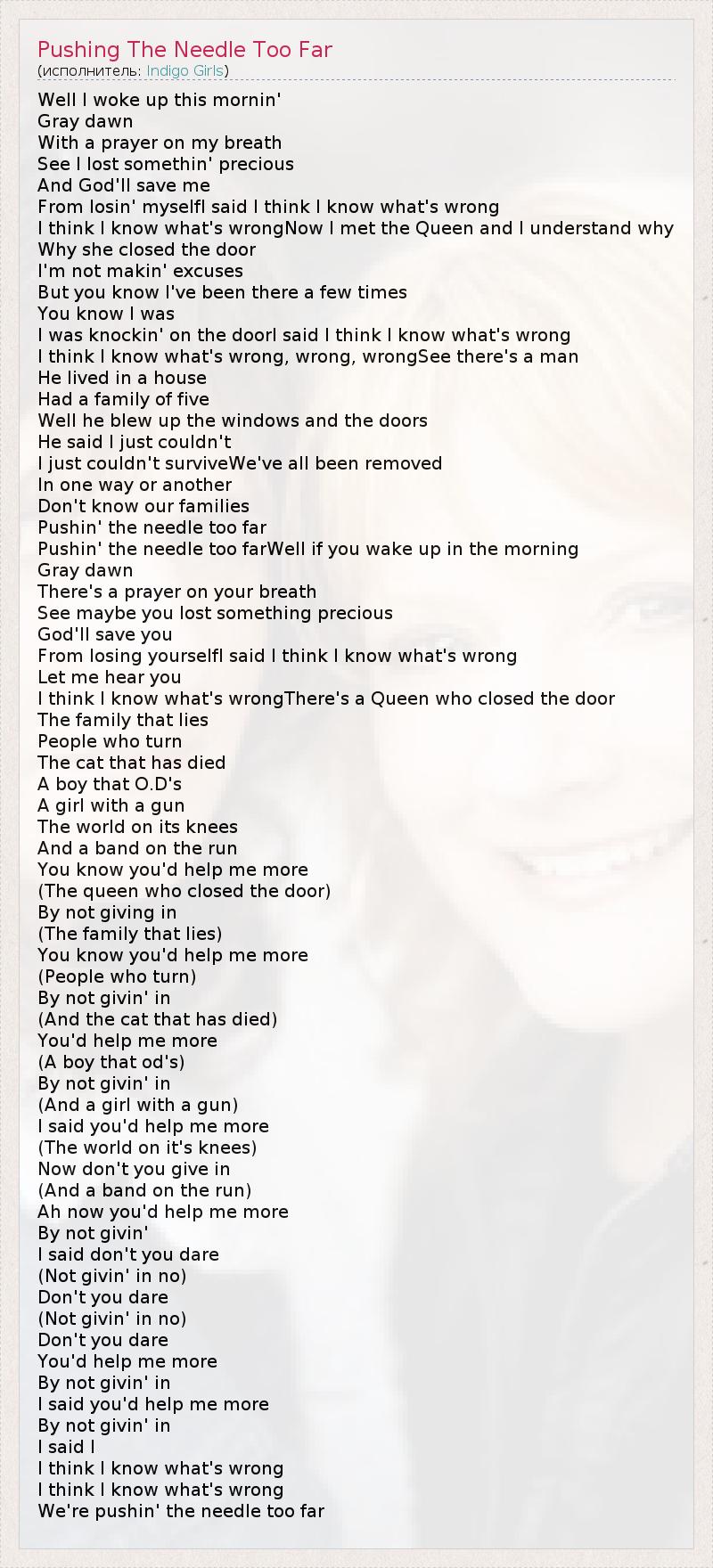 А как ты думаешь, о чем песня "Pushing The Needle Too Far" ?