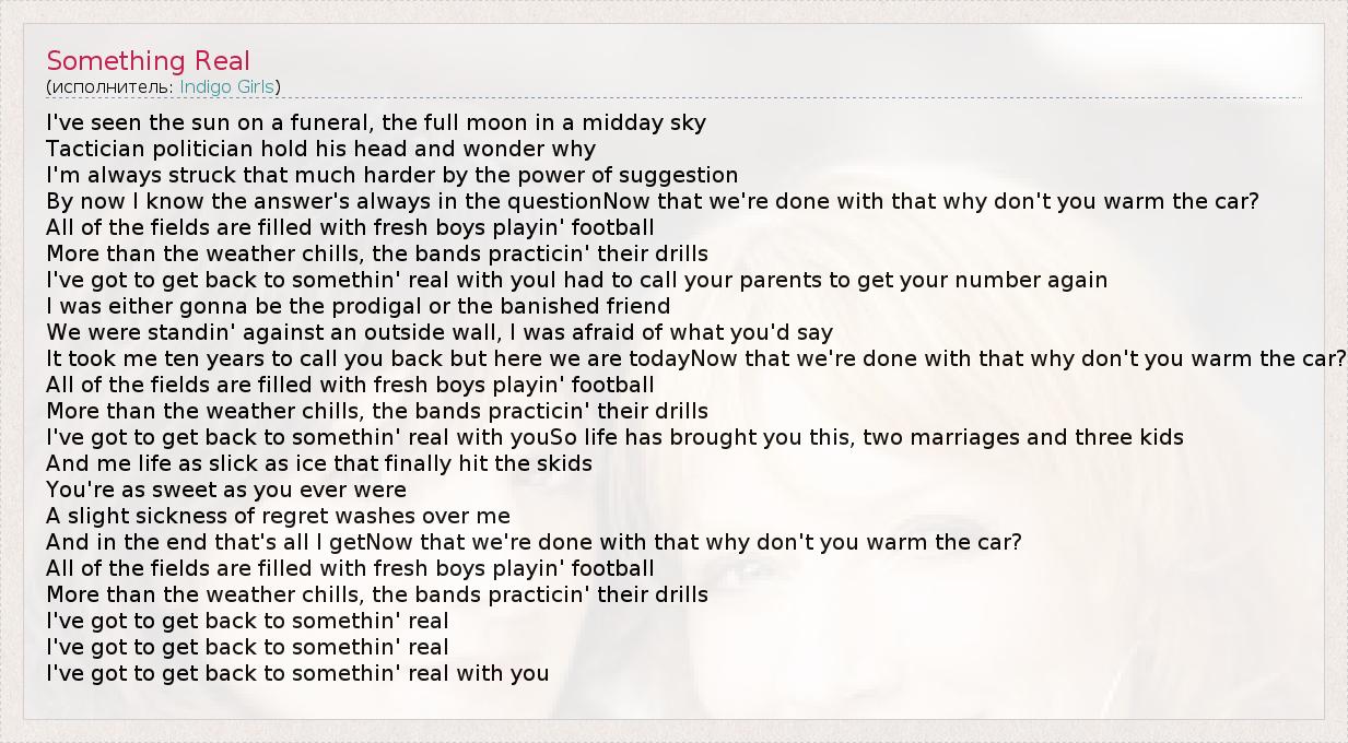 Это интересно:Indigo Girls это Amy Ray и Emily Saliers. Они встретились на игровой площадке начальной школы в Дэкетуре, штат Джоржия и выступают вместе со школы. Они записались на Epic Records в 1989 и получили грэмми за лучшее фолк-альбом в том же году (за одноимённый релиз). Их хитами были такие песни, как "Galileo", "Closer... продолжение