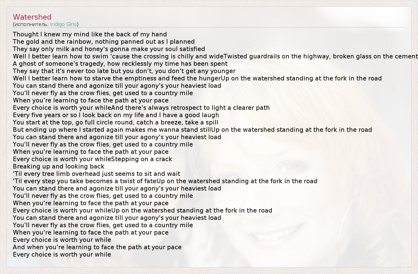 'Til every step you take becomes a twist of fateUp on the watershed standing at the fork in the road