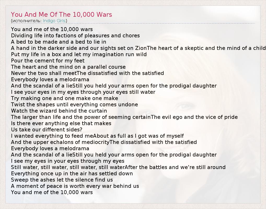 А как ты думаешь, о чем песня "You And Me Of The 10,000 Wars" ?