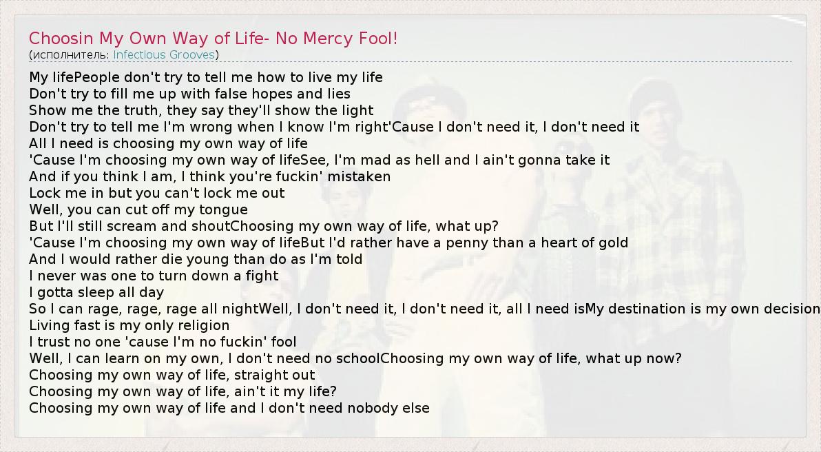 А как ты думаешь, о чем песня "Choosin My Own Way of Life- No Mercy Fool!" ?