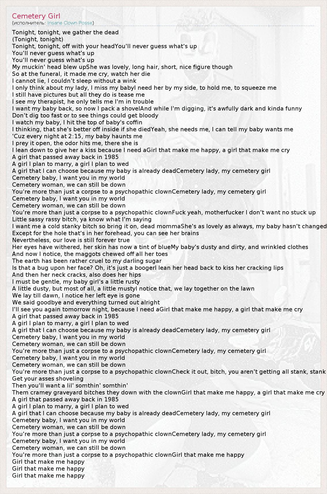 You're more than just a corpse to a psychopathic clownCemetery lady, my cemetery girl