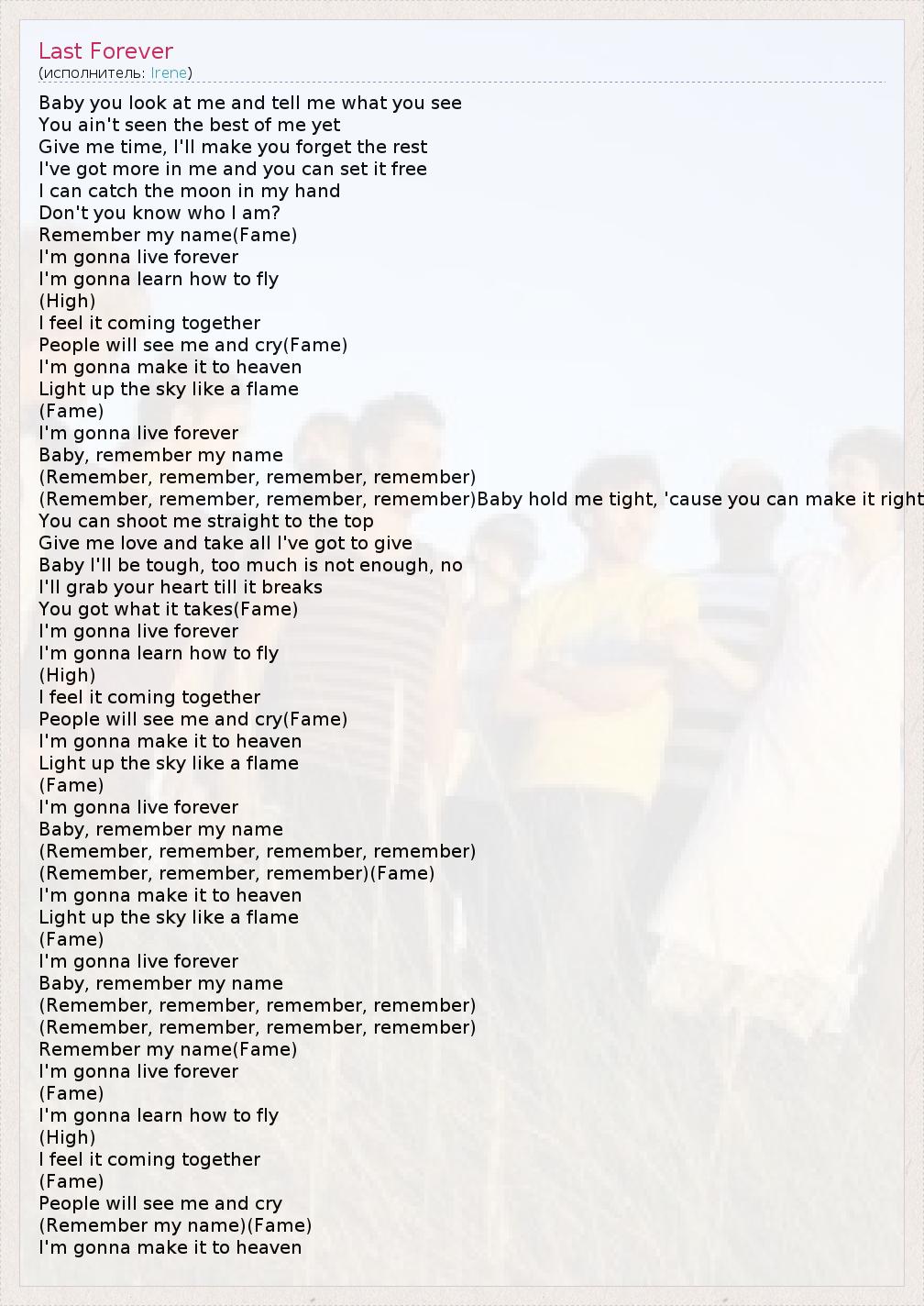 Baby you look at me and tell me what you see You ain't seen the best of me yet Give me time, I'll make you forget the rest I've got more in me and you can set it free I can catch the moon in my hand Don't you know who I am? Remember my name(Fame) I'm gonna live forever I'm gonna learn how to fly (High) I feel it coming together People will see me and cry(Fame) I'm gonna make it to heaven Light up the sky like a flame (Fame) I'm gonna live forever Baby, remember my name (Remember, remember, remember, remember) (Remember, remember, remember, remember)Baby hold me tight, 'cause you can make it right You can shoot me straight to the top Give me love and take all I've got to give Baby I'll be tough, too much is not enough, no I'll grab your heart till it breaks You got what it takes(Fame) I'm gonna live forever I'm gonna learn how to fly (High) I feel it coming together People will see me and cry(Fame) I'm gonna make it to heaven Light up the sky like a flame (Fame) I'm gonna live forever Baby, remember my name (Remember, remember, remember, remember) (Remember, remember, remember)(Fame) I'm gonna make it to heaven Light up the sky like a flame (Fame) I'm gonna live forever Baby, remember my name (Remember, remember, remember, remember) (Remember, remember, remember, remember) Remember my name(Fame) I'm gonna live forever (Fame) I'm gonna learn how to fly (High) I feel it coming together (Fame) People will see me and cry (Remember my name)(Fame) I'm gonna make it to heaven