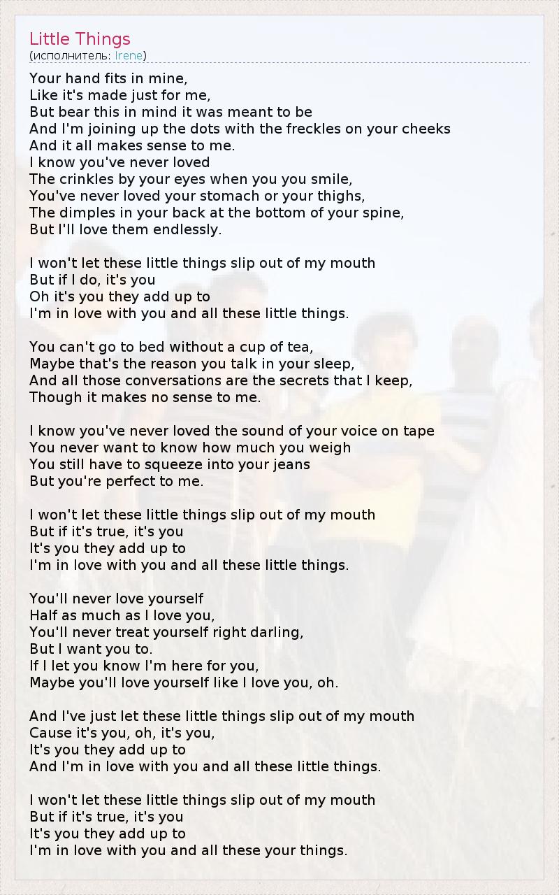 Твоя рука так идеально подходит моей, Словно только мне и предназначена, Поэтому помни об этом, ведь так было суждено, И я следую за каждой точкой и веснушкой на твоих щеках, И для меня это всё имеет смысл. Я знаю, ты никогда не любила Морщинки в уголках своих глаз, появляющиеся при улыбке, Ты никогда не любила свои живот и бёдра, Ямочки на своей спине в нижней части позвоночника, Но я люблю их бесконечно. И я не дам этим мелочам соскользнуть с моих губ, Но если всё же ты услышишь их, то только тебе, Только тебе они предназначены, Я влюблён в тебя и во все эти мелочи. Ты не можешь пойти спать, не выпив перед сном чашки чая, И, может, именно поэтому ты говоришь во сне, И все эти разговоры - мой тщательно скрываемый секрет, Хоть я и не понимаю этих бессвязных речей. Я знаю, ты никогда не любила, как звучит твой голос со стороны, Ты всегда боишься взвешиваться, Тебе всё ещё надо втискиваться в джинсы, Но для меня ты идеальна. И я не дам этим мелочам соскользнуть с моих губ, Но если это правда, то только тебе, Только тебе они предназначены. Я влюблён в тебя и во все эти мелочи. Ты никогда не будешь любить себя Хотя бы вполовину так, как я люблю тебя, Ты никогда не относишься к себе должным образом, дорогая, Но я хотел бы, чтобы ты начала. Если я дам тебе знать, что я всегда рядом, Может, ты полюбишь себя так, как я тебя люблю. И я просто дал этим мелочам соскользнуть с моих губ, Потому что только тебе, только тебе, Только тебе они предназначены, И я влюблён в тебя и во все эти мелочи. Я не дам этим мелочам соскользнуть с моих губ, Но если это правда, то только тебе, Только тебе они предназначены. Я влюблён в тебя и во все твои мелочи.