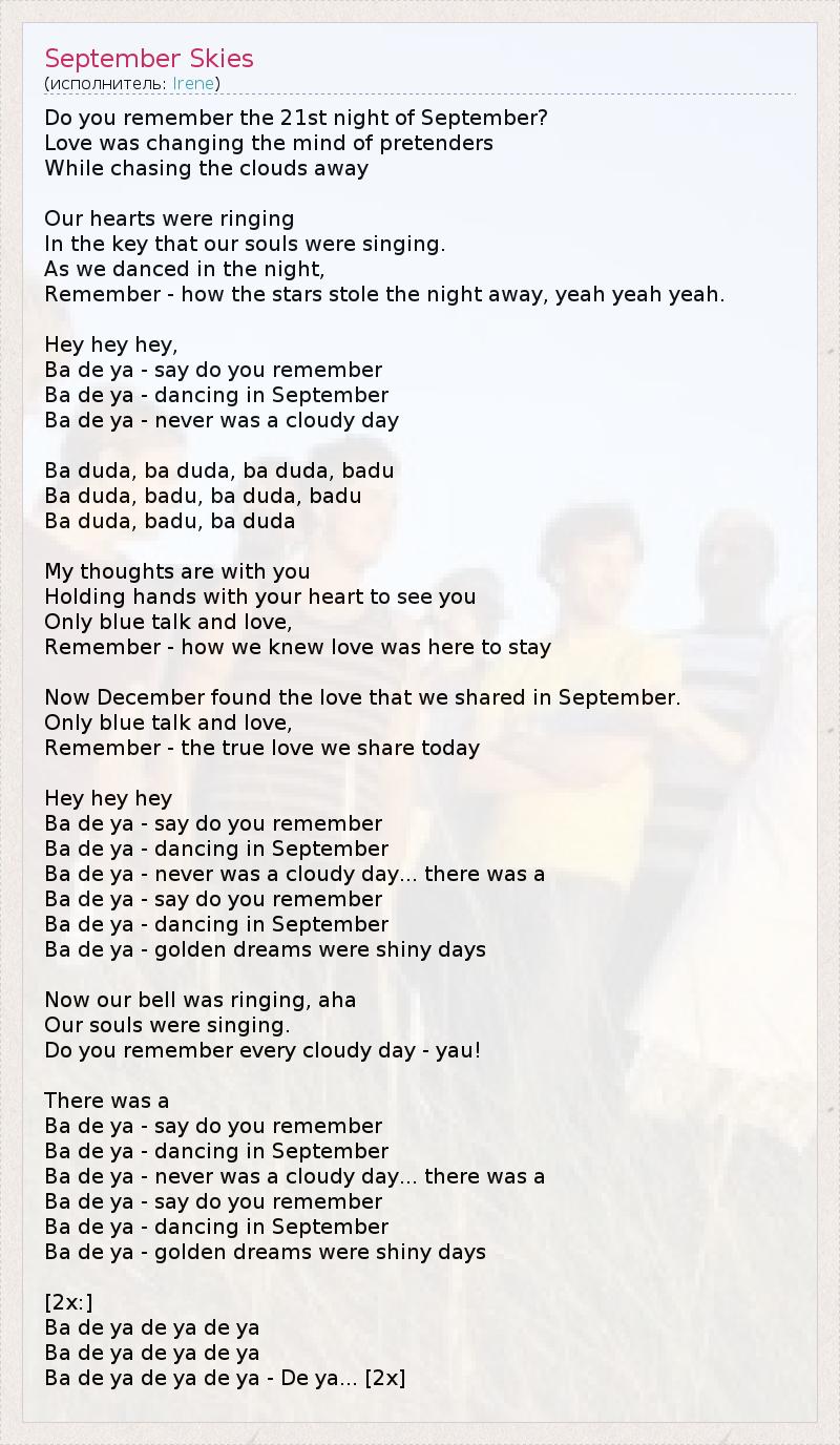 Ты помнишь 21-ую ночь сентября? Тогда любовь преобразила взгляды двух притворщиков, Разогнав покров тьмы. Наши сердца звенели В том же ключе, в котором пели наши души. Пока мы танцевали в ночи, Помнишь, как ярко её осветили звёзды? 1 Да, да, да! Эй, эй, эй Ба-ду-а - скажи, ты помнишь... Ба-ду-а - танец в сентябре? Ба-ду-а - в тот день не было ни облачка. Ба-дуда, ба-дуда, ба-дуда, баду Ба-дуда, баду, ба-дуда, баду Ба-дуда, баду, ба-дуба Мои мысли с тобой, Прикасаюсь к твоей душе, 2 чтобы увидеть тебя. Лишь непристойные разговоры и любовь... Помнишь, как нам стало ясно, что эта любовь навсегда? Теперь декабрь познал любовь, которую мы разделили в сентябре. Лишь непристойные разговоры и любовь... Помни: настоящая любовь - та, что мы испытываем сейчас. Эй, эй, эй Ба-ду-а - скажи, ты помнишь... Ба-ду-а - танец в сентябре? Ба-ду-а - в тот день не было ни облачка. Было... Ба-ду-а - скажи, ты помнишь... Ба-ду-а - танец в сентябре? Ба-ду-а - голубой мечтой были те солнечные дни. Теперь звонил наш колокольчик, ага, Наши души пели. Ты помнишь каждый облачный день? Да! Было... Ба-ду-а - скажи, ты помнишь... Ба-ду-а - танец в сентябре? Ба-ду-а - в тот день не было ни облачка. Было... Ба-ду-а - скажи, ты помнишь... Ба-ду-а - танец в сентябре? Ба-ду-а - голубой мечтой были те солнечные дни. [2x:] Ба-ду-а, ду-а, ду-а. Ба-ду-а, ду-а, ду-а. Ба-ду-а, ду-а, ду-а... 1 - буквально: Помнишь, как звёзды её [ночь] украли? 2 - буквально: пожимаю руки твоей душе/сердцу 3 - фразеологизм: ring the/one's bell ~ приходить на память, казаться знакомым, напоминать