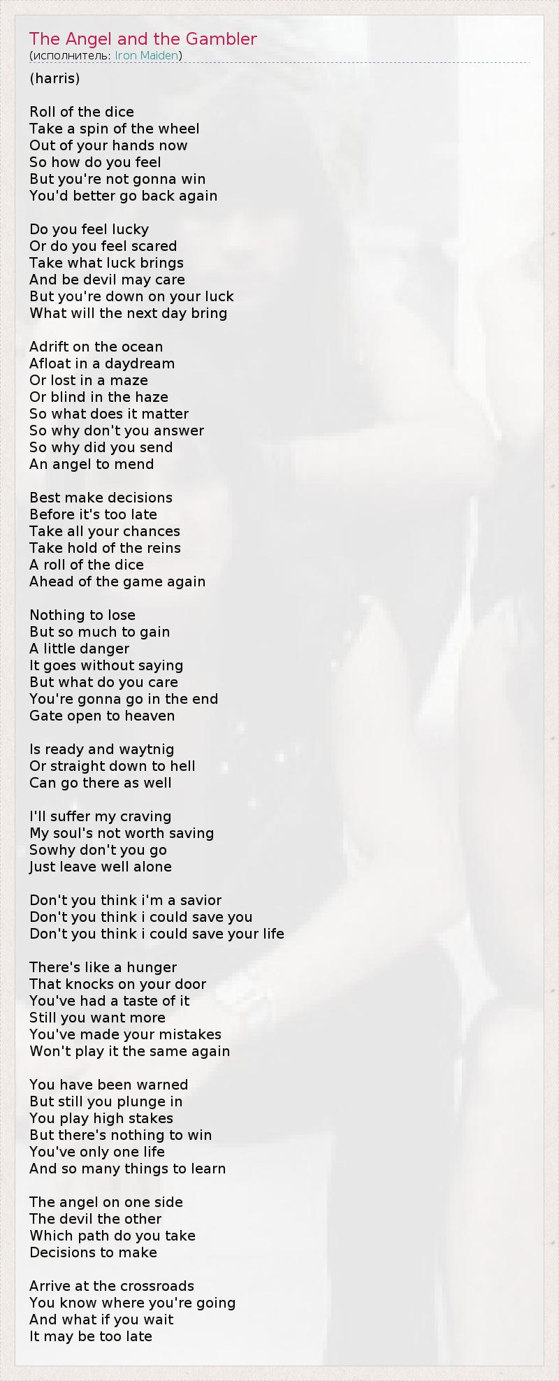 (harris) Roll of the dice Take a spin of the wheel Out of your hands now So how do you feel But you're not gonna win You'd better go back again Do you feel lucky Or do you feel scared Take what luck brings And be devil may care But you're down on your luck What will the next day bring Adrift on the ocean Afloat in a daydream Or lost in a maze Or blind in the haze So what does it matter So why don't you answer So why did you send An angel to mend Best make decisions Before it's too late Take all your chances Take hold of the reins A roll of the dice Ahead of the game again Nothing to lose But so much to gain A little danger It goes without saying But what do you care You're gonna go in the end Gate open to heaven Is ready and waytnig Or straight down to hell Can go there as well I'll suffer my craving My soul's not worth saving Sowhy don't you go Just leave well alone Don't you think i'm a savior Don't you think i could save you Don't you think i could save your life There's like a hunger That knocks on your door You've had a taste of it Still you want more You've made your mistakes Won't play it the same again You have been warned But still you plunge in You play high stakes But there's nothing to win You've only one life And so many things to learn The angel on one side The devil the other Which path do you take Decisions to make Arrive at the crossroads You know where you're going And what if you wait It may be too late