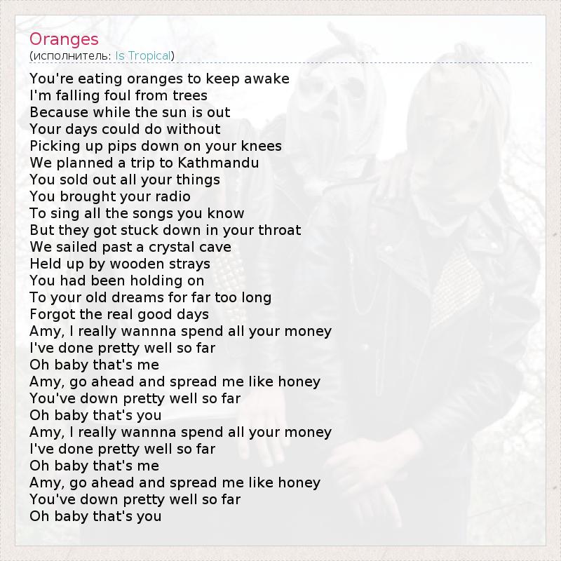 You're eating oranges to keep awake I'm falling foul from trees Because while the sun is out Your days could do without Picking up pips down on your knees We planned a trip to Kathmandu You sold out all your things You brought your radio To sing all the songs you know But they got stuck down in your throat We sailed past a crystal cave Held up by wooden strays You had been holding on To your old dreams for far too long Forgot the real good days Amy, I really wannna spend all your money I've done pretty well so far Oh baby that's me Amy, go ahead and spread me like honey You've down pretty well so far Oh baby that's you Amy, I really wannna spend all your money I've done pretty well so far Oh baby that's me Amy, go ahead and spread me like honey You've down pretty well so far Oh baby that's you