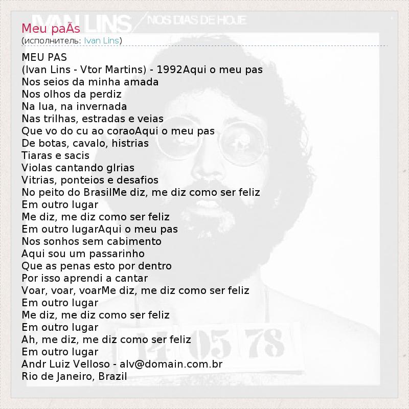 MEU PAS (Ivan Lins - Vtor Martins) - 1992Aqui o meu pas Nos seios da minha amada Nos olhos da perdiz Na lua, na invernada Nas trilhas, estradas e veias Que vo do cu ao coraoAqui o meu pas De botas, cavalo, histrias Tiaras e sacis Violas cantando glrias Vitrias, ponteios e desafios No peito do BrasilMe diz, me diz como ser feliz Em outro lugar Me diz, me diz como ser feliz Em outro lugarAqui o meu pas Nos sonhos sem cabimento Aqui sou um passarinho Que as penas esto por dentro Por isso aprendi a cantar Voar, voar, voarMe diz, me diz como ser feliz Em outro lugar Me diz, me diz como ser feliz Em outro lugar Ah, me diz, me diz como ser feliz Em outro lugar Andr Luiz Velloso - alv@domain.com.br Rio de Janeiro, Brazil