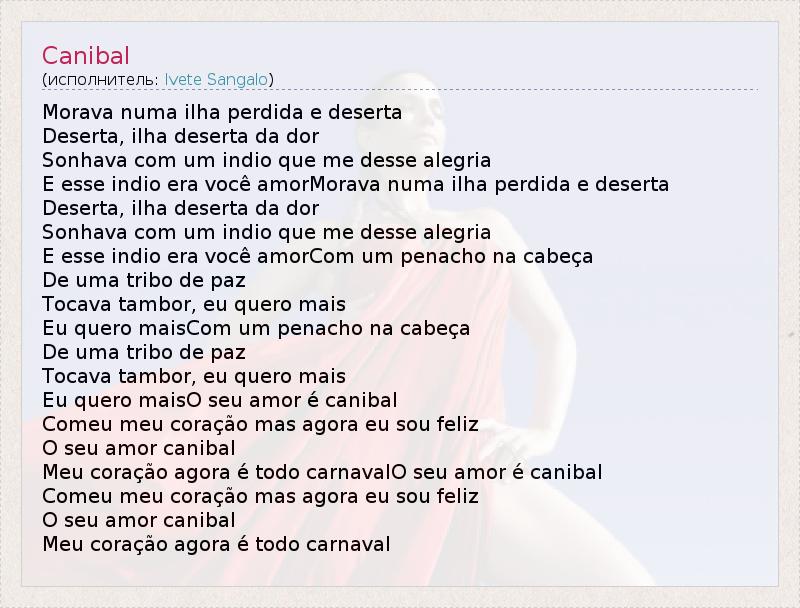 Morava numa ilha perdida e deserta Deserta, ilha deserta da dor Sonhava com um indio que me desse alegria E esse indio era você amorMorava numa ilha perdida e deserta Deserta, ilha deserta da dor Sonhava com um indio que me desse alegria E esse indio era você amorCom um penacho na cabeça De uma tribo de paz Tocava tambor, eu quero mais Eu quero maisCom um penacho na cabeça De uma tribo de paz Tocava tambor, eu quero mais Eu quero maisO seu amor é canibal Comeu meu coração mas agora eu sou feliz O seu amor canibal Meu coração agora é todo carnavalO seu amor é canibal Comeu meu coração mas agora eu sou feliz O seu amor canibal Meu coração agora é todo carnaval