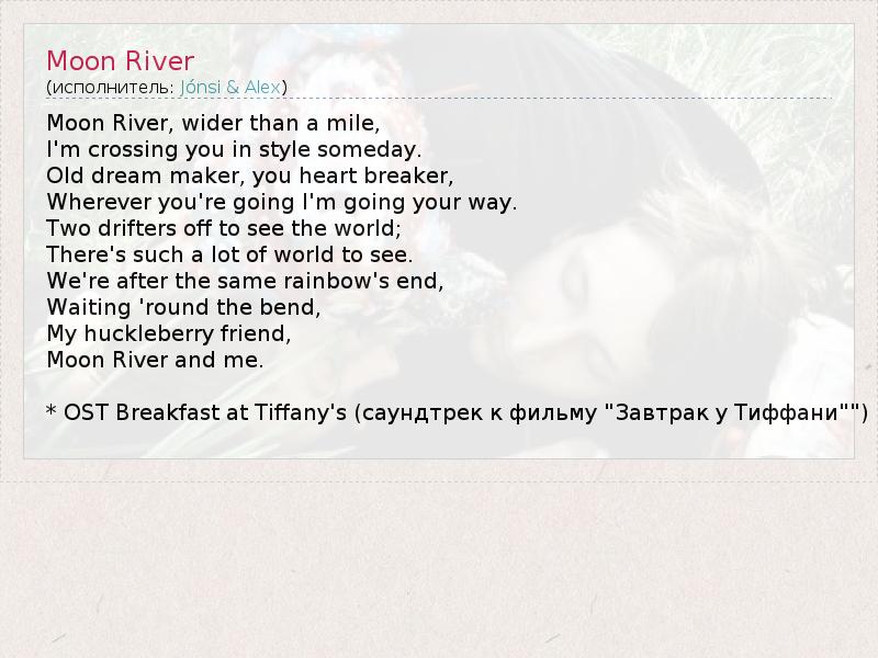 Moon River, wider than a mile, I'm crossing you in style someday. Old dream maker, you heart breaker, Wherever you're going I'm going your way. Two drifters off to see the world; There's such a lot of world to see. We're after the same rainbow's end, Waiting 'round the bend, My huckleberry friend, Moon River and me. * OST Breakfast at Tiffany's (саундтрек к фильму "Завтрак у Тиффани"")