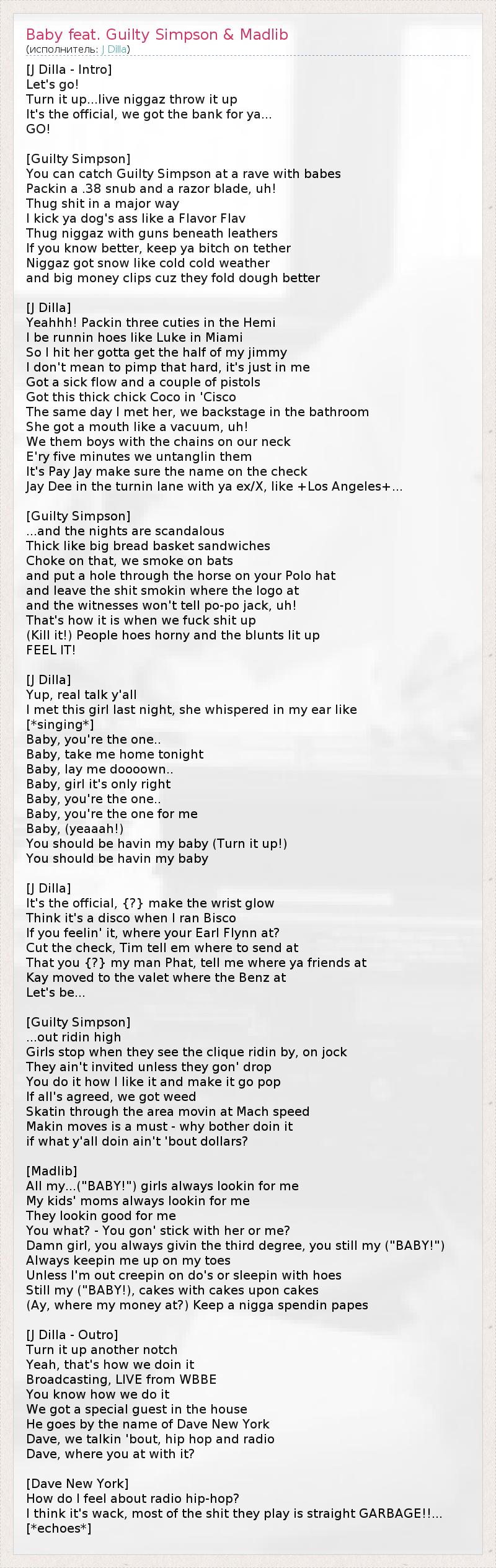А как ты думаешь, о чем песня "Baby feat. Guilty Simpson & Madlib" ?
