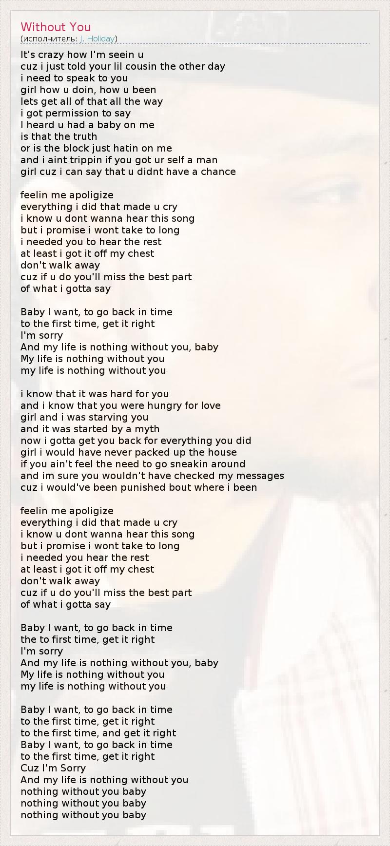 It's crazy how I'm seein u cuz i just told your lil cousin the other day i need to speak to you girl how u doin, how u been lets get all of that all the way i got permission to say I heard u had a baby on me is that the truth or is the block just hatin on me and i aint trippin if you got ur self a man girl cuz i can say that u didnt have a chance feelin me apoligize everything i did that made u cry i know u dont wanna hear this song but i promise i wont take to long i needed you to hear the rest at least i got it off my chest don't walk away cuz if u do you'll miss the best part of what i gotta say Baby I want, to go back in time to the first time, get it right I'm sorry And my life is nothing without you, baby My life is nothing without you my life is nothing without you i know that it was hard for you and i know that you were hungry for love girl and i was starving you and it was started by a myth now i gotta get you back for everything you did girl i would have never packed up the house if you ain't feel the need to go sneakin around and im sure you wouldn't have checked my messages cuz i would've been punished bout where i been feelin me apoligize everything i did that made u cry i know u dont wanna hear this song but i promise i wont take to long i needed you hear the rest at least i got it off my chest don't walk away cuz if u do you'll miss the best part of what i gotta say Baby I want, to go back in time the to first time, get it right I'm sorry And my life is nothing without you, baby My life is nothing without you my life is nothing without you Baby I want, to go back in time to the first time, get it right to the first time, and get it right Baby I want, to go back in time to the first time, get it right Cuz I'm Sorry And my life is nothing without you nothing without you baby nothing without you baby nothing without you baby