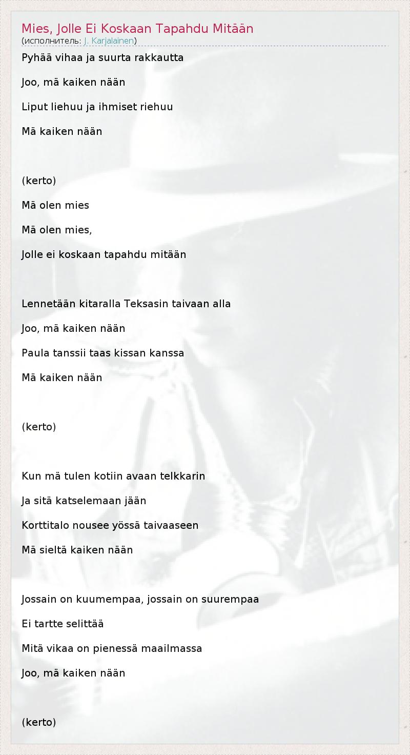 ГлавнаяИсполнителиJ. KarjalainenMies, Jolle Ei Koskaan Tapahdu Mitään