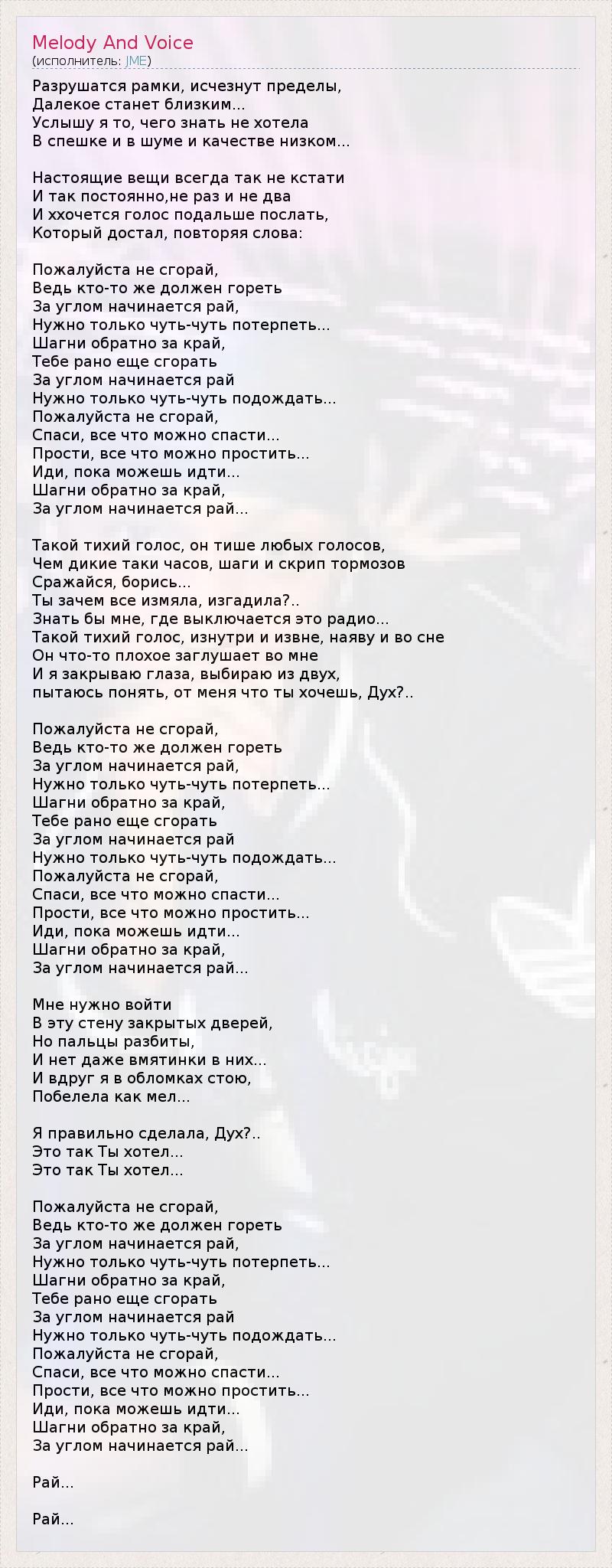 Разрушатся рамки, исчезнут пределы, Далекое станет близким... Услышу я то, чего знать не хотела В спешке и в шуме и качестве низком... Настоящие вещи всегда так не кстати И так постоянно,не раз и не два И ххочется голос подальше послать, Который достал, повторяя слова: Пожалуйста не сгорай, Ведь кто-то же должен гореть За углом начинается рай, Нужно только чуть-чуть потерпеть... Шагни обратно за край, Тебе рано еще сгорать За углом начинается рай Нужно только чуть-чуть подождать... Пожалуйста не сгорай, Спаси, все что можно спасти... Прости, все что можно простить... Иди, пока можешь идти... Шагни обратно за край, За углом начинается рай... Такой тихий голос, он тише любых голосов, Чем дикие таки часов, шаги и скрип тормозов Сражайся, борись... Ты зачем все измяла, изгадила?.. Знать бы мне, где выключается это радио... Такой тихий голос, изнутри и извне, наяву и во сне Он что-то плохое заглушает во мне И я закрываю глаза, выбираю из двух, пытаюсь понять, от меня что ты хочешь, Дух?.. Пожалуйста не сгорай, Ведь кто-то же должен гореть За углом начинается рай, Нужно только чуть-чуть потерпеть... Шагни обратно за край, Тебе рано еще сгорать За углом начинается рай Нужно только чуть-чуть подождать... Пожалуйста не сгорай, Спаси, все что можно спасти... Прости, все что можно простить... Иди, пока можешь идти... Шагни обратно за край, За углом начинается рай... Мне нужно войти В эту стену закрытых дверей, Но пальцы разбиты, И нет даже вмятинки в них... И вдруг я в обломках стою, Побелела как мел... Я правильно сделала, Дух?.. Это так Ты хотел... Это так Ты хотел... Пожалуйста не сгорай, Ведь кто-то же должен гореть За углом начинается рай, Нужно только чуть-чуть потерпеть... Шагни обратно за край, Тебе рано еще сгорать За углом начинается рай Нужно только чуть-чуть подождать... Пожалуйста не сгорай, Спаси, все что можно спасти... Прости, все что можно простить... Иди, пока можешь идти... Шагни обратно за край, За углом начинается рай... Рай... Рай...