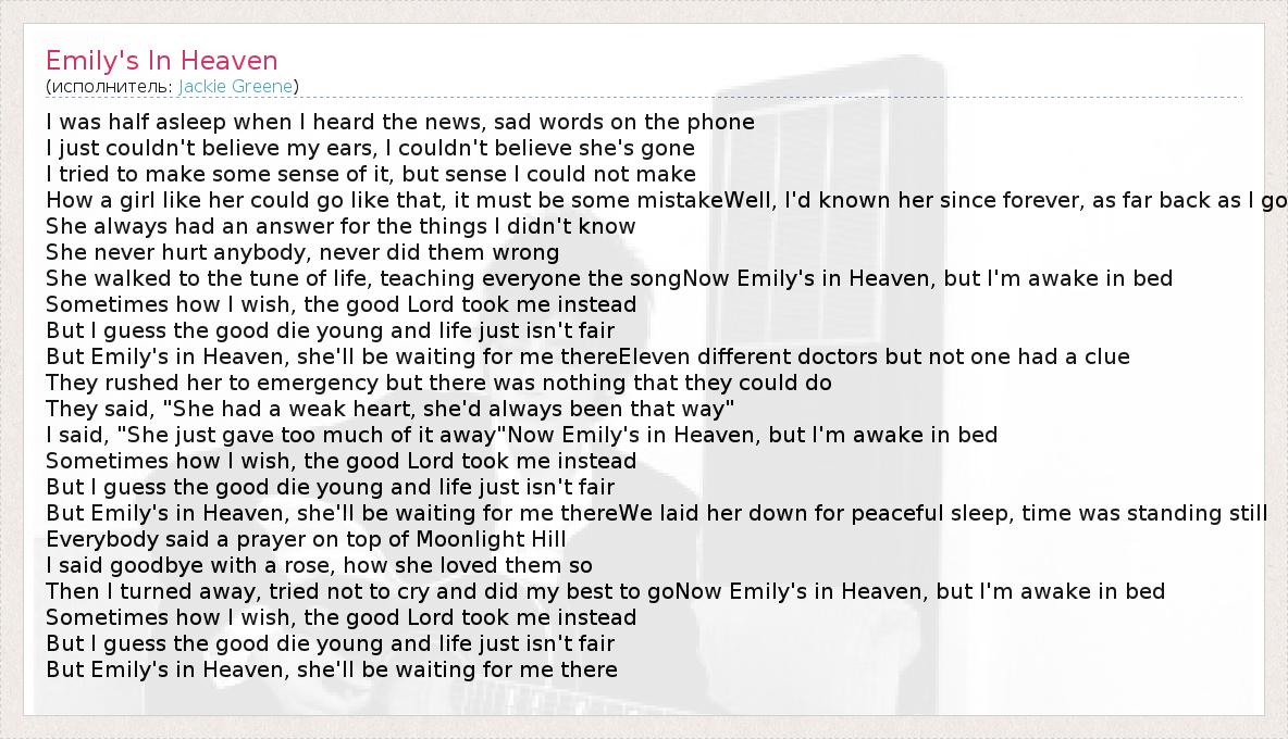 She walked to the tune of life, teaching everyone the songNow Emily's in Heaven, but I'm awake in bed