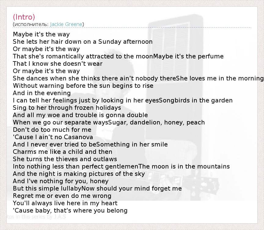 Maybe it's the way She lets her hair down on a Sunday afternoon Or maybe it's the way That she's romantically attracted to the moonMaybe it's the perfume That I know she doesn't wear Or maybe it's the way She dances when she thinks there ain't nobody thereShe loves me in the morning Without warning before the sun begins to rise And in the evening I can tell her feelings just by looking in her eyesSongbirds in the garden Sing to her through frozen holidays And all my woe and trouble is gonna double When we go our separate waysSugar, dandelion, honey, peach Don't do too much for me 'Cause I ain't no Casanova And I never ever tried to beSomething in her smile Charms me like a child and then She turns the thieves and outlaws Into nothing less than perfect gentlemenThe moon is in the mountains And the night is making pictures of the sky And I've nothing for you, honey But this simple lullabyNow should your mind forget me Regret me or even do me wrong You'll always live here in my heart 'Cause baby, that's where you belong