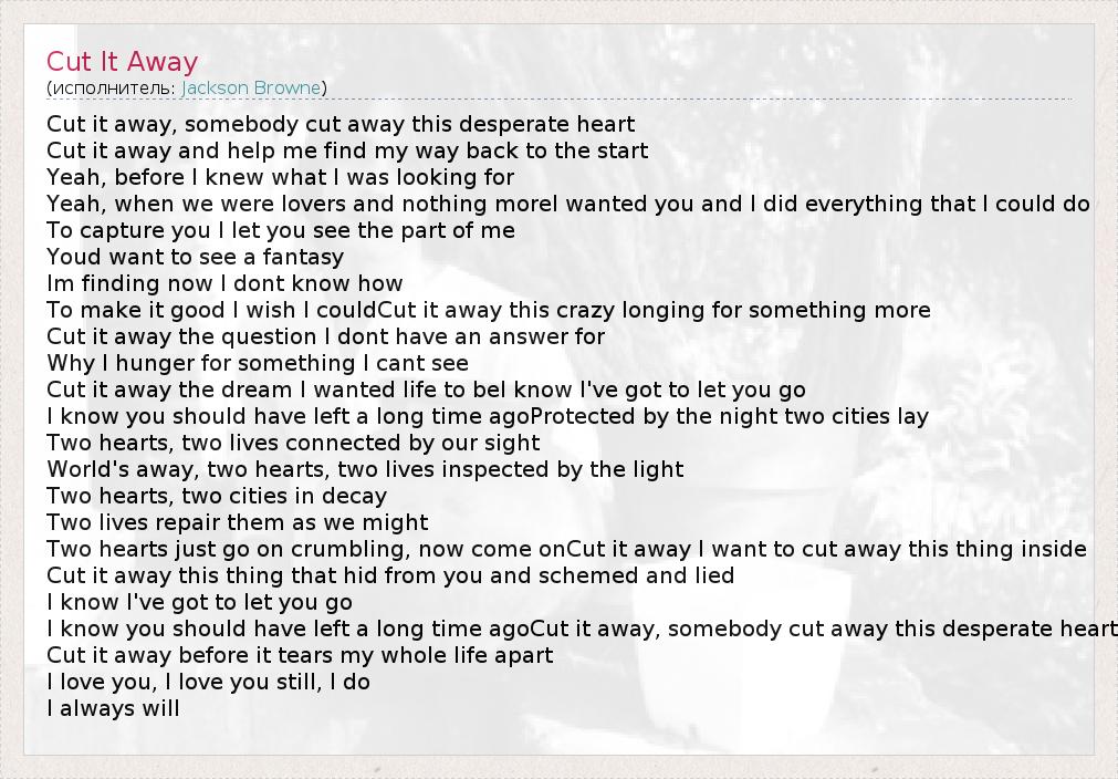 Cut it away, somebody cut away this desperate heart Cut it away and help me find my way back to the start Yeah, before I knew what I was looking for Yeah, when we were lovers and nothing moreI wanted you and I did everything that I could do To capture you I let you see the part of me Youd want to see a fantasy Im finding now I dont know how To make it good I wish I couldCut it away this crazy longing for something more Cut it away the question I dont have an answer for Why I hunger for something I cant see Cut it away the dream I wanted life to beI know I've got to let you go I know you should have left a long time agoProtected by the night two cities lay Two hearts, two lives connected by our sight World's away, two hearts, two lives inspected by the light Two hearts, two cities in decay Two lives repair them as we might Two hearts just go on crumbling, now come onCut it away I want to cut away this thing inside Cut it away this thing that hid from you and schemed and lied I know I've got to let you go I know you should have left a long time agoCut it away, somebody cut away this desperate heart Cut it away before it tears my whole life apart I love you, I love you still, I do I always will