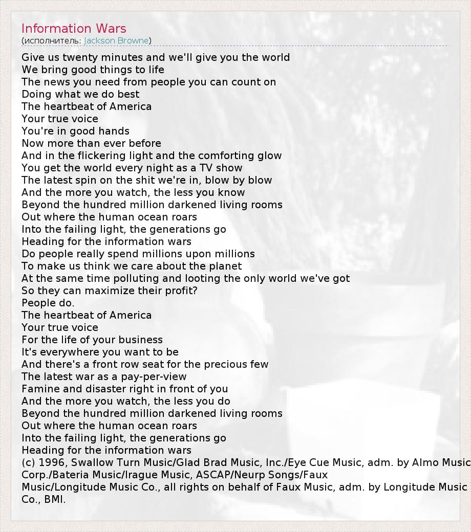 Give us twenty minutes and we'll give you the world We bring good things to life The news you need from people you can count on Doing what we do best The heartbeat of America Your true voice You're in good hands Now more than ever before And in the flickering light and the comforting glow You get the world every night as a TV show The latest spin on the shit we're in, blow by blow And the more you watch, the less you know Beyond the hundred million darkened living rooms Out where the human ocean roars Into the failing light, the generations go Heading for the information wars Do people really spend millions upon millions To make us think we care about the planet At the same time polluting and looting the only world we've got So they can maximize their profit? People do. The heartbeat of America Your true voice For the life of your business It's everywhere you want to be And there's a front row seat for the precious few The latest war as a pay-per-view Famine and disaster right in front of you And the more you watch, the less you do Beyond the hundred million darkened living rooms Out where the human ocean roars Into the failing light, the generations go Heading for the information wars (c) 1996, Swallow Turn Music/Glad Brad Music, Inc./Eye Cue Music, adm. by Almo Music Corp./Bateria Music/Irague Music, ASCAP/Neurp Songs/Faux Music/Longitude Music Co., all rights on behalf of Faux Music, adm. by Longitude Music Co., BMI.