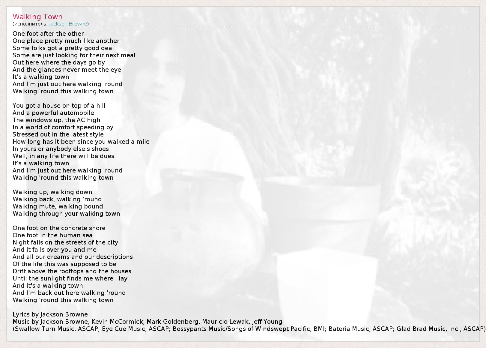 Это интересно:Джексон Брауни известен как автор песен, хотя и сам начиная с 1972 года выпустил 13 студийных альбомов. К сожалению Брауни в отличие от Бонни Райтт, исполнившей множество его песен, так и не стал широко популярен.