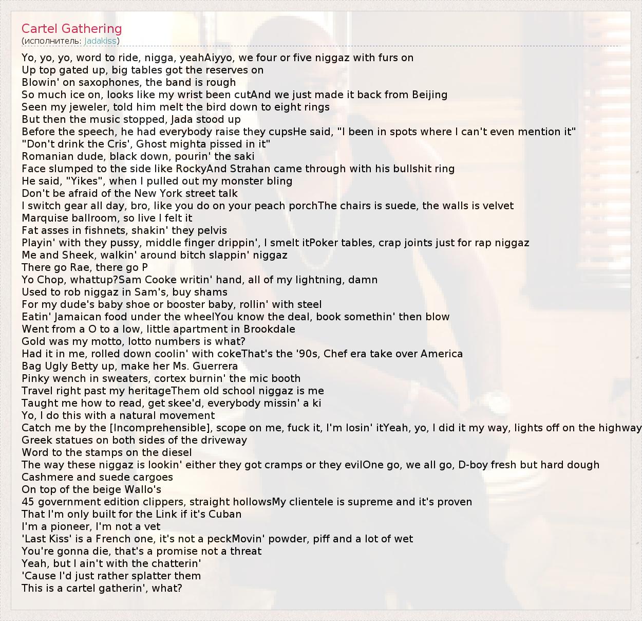Yo, yo, yo, word to ride, nigga, yeahAiyyo, we four or five niggaz with furs on Up top gated up, big tables got the reserves on Blowin' on saxophones, the band is rough So much ice on, looks like my wrist been cutAnd we just made it back from Beijing Seen my jeweler, told him melt the bird down to eight rings But then the music stopped, Jada stood up Before the speech, he had everybody raise they cupsHe said, "I been in spots where I can't even mention it" "Don't drink the Cris', Ghost mighta pissed in it" Romanian dude, black down, pourin' the saki Face slumped to the side like RockyAnd Strahan came through with his bullshit ring He said, "Yikes", when I pulled out my monster bling Don't be afraid of the New York street talk I switch gear all day, bro, like you do on your peach porchThe chairs is suede, the walls is velvet Marquise ballroom, so live I felt it Fat asses in fishnets, shakin' they pelvis Playin' with they pussy, middle finger drippin', I smelt itPoker tables, crap joints just for rap niggaz Me and Sheek, walkin' around bitch slappin' niggaz There go Rae, there go P Yo Chop, whattup?Sam Cooke writin' hand, all of my lightning, damn Used to rob niggaz in Sam's, buy shams For my dude's baby shoe or booster baby, rollin' with steel Eatin' Jamaican food under the wheelYou know the deal, book somethin' then blow Went from a O to a low, little apartment in Brookdale Gold was my motto, lotto numbers is what? Had it in me, rolled down coolin' with cokeThat's the '90s, Chef era take over America Bag Ugly Betty up, make her Ms. Guerrera Pinky wench in sweaters, cortex burnin' the mic booth Travel right past my heritageThem old school niggaz is me Taught me how to read, get skee'd, everybody missin' a ki Yo, I do this with a natural movement Catch me by the [Incomprehensible], scope on me, fuck it, I'm losin' itYeah, yo, I did it my way, lights off on the highway Greek statues on both sides of the driveway Word to the stamps on the diesel The way these niggaz is lookin' either they got cramps or they evilOne go, we all go, D-boy fresh but hard dough Cashmere and suede cargoes On top of the beige Wallo's 45 government edition clippers, straight hollowsMy clientele is supreme and it's proven That I'm only built for the Link if it's Cuban I'm a pioneer, I'm not a vet 'Last Kiss' is a French one, it's not a peckMovin' powder, piff and a lot of wet You're gonna die, that's a promise not a threat Yeah, but I ain't with the chatterin' 'Cause I'd just rather splatter them This is a cartel gatherin', what?