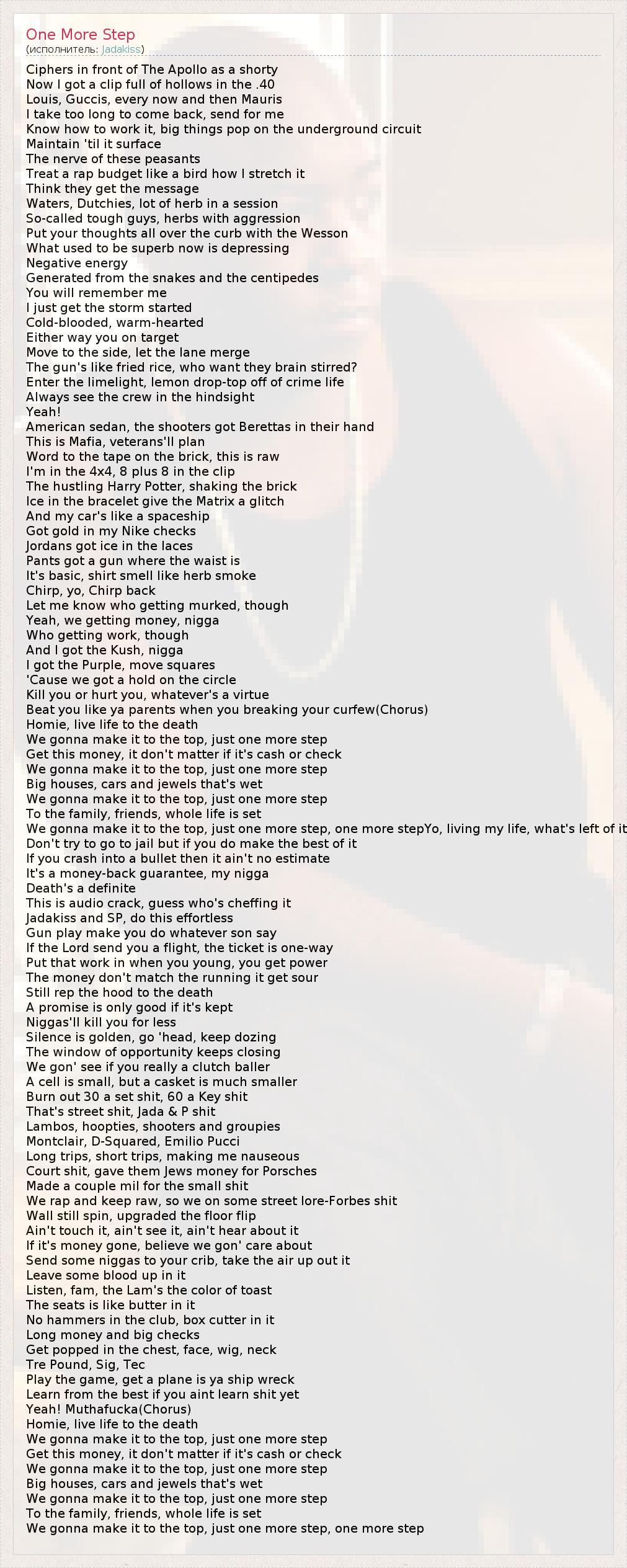 We gonna make it to the top, just one more step, one more stepYo, living my life, what's left of it