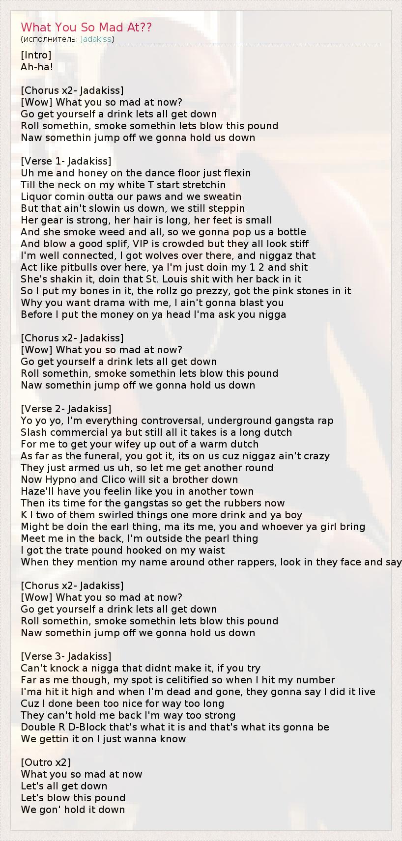 [Intro] Ah-ha! [Chorus x2- Jadakiss] [Wow] What you so mad at now? Go get yourself a drink lets all get down Roll somethin, smoke somethin lets blow this pound Naw somethin jump off we gonna hold us down [Verse 1- Jadakiss] Uh me and honey on the dance floor just flexin Till the neck on my white T start stretchin Liquor comin outta our paws and we sweatin But that ain't slowin us down, we still steppin Her gear is strong, her hair is long, her feet is small And she smoke weed and all, so we gonna pop us a bottle And blow a good splif, VIP is crowded but they all look stiff I'm well connected, I got wolves over there, and niggaz that Act like pitbulls over here, ya I'm just doin my 1 2 and shit She's shakin it, doin that St. Louis shit with her back in it So I put my bones in it, the rollz go prezzy, got the pink stones in it Why you want drama with me, I ain't gonna blast you Before I put the money on ya head I'ma ask you nigga [Chorus x2- Jadakiss] [Wow] What you so mad at now? Go get yourself a drink lets all get down Roll somethin, smoke somethin lets blow this pound Naw somethin jump off we gonna hold us down [Verse 2- Jadakiss] Yo yo yo, I'm everything controversal, underground gangsta rap Slash commercial ya but still all it takes is a long dutch For me to get your wifey up out of a warm dutch As far as the funeral, you got it, its on us cuz niggaz ain't crazy They just armed us uh, so let me get another round Now Hypno and Clico will sit a brother down Haze'll have you feelin like you in another town Then its time for the gangstas so get the rubbers now K I two of them swirled things one more drink and ya boy Might be doin the earl thing, ma its me, you and whoever ya girl bring Meet me in the back, I'm outside the pearl thing I got the trate pound hooked on my waist When they mention my name around other rappers, look in they face and say [Chorus x2- Jadakiss] [Wow] What you so mad at now? Go get yourself a drink lets all get down Roll somethin, smoke somethin lets blow this pound Naw somethin jump off we gonna hold us down [Verse 3- Jadakiss] Can't knock a nigga that didnt make it, if you try Far as me though, my spot is celitified so when I hit my number I'ma hit it high and when I'm dead and gone, they gonna say I did it live Cuz I done been too nice for way too long They can't hold me back I'm way too strong Double R D-Block that's what it is and that's what its gonna be We gettin it on I just wanna know [Outro x2] What you so mad at now Let's all get down Let's blow this pound We gon' hold it down