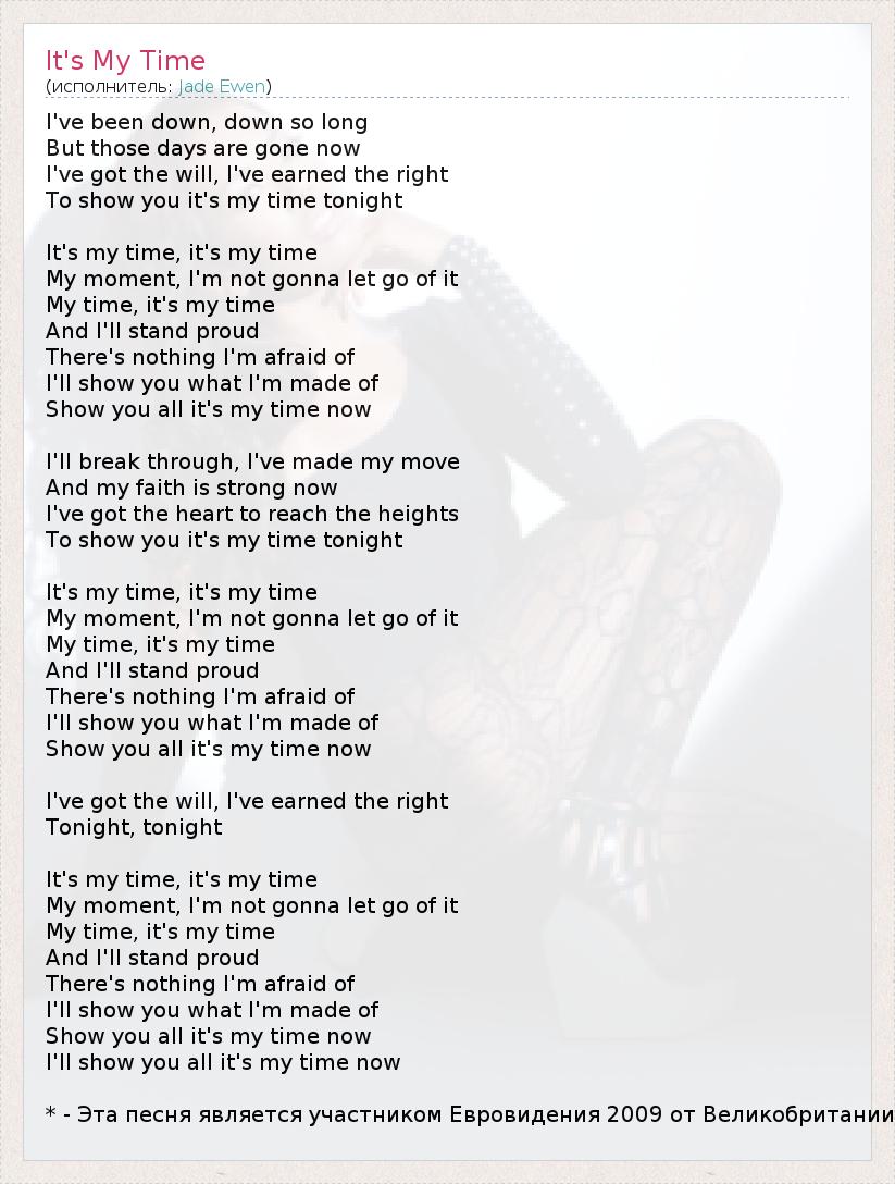 I've been down, down so long But those days are gone now I've got the will, I've earned the right To show you it's my time tonight It's my time, it's my time My moment, I'm not gonna let go of it My time, it's my time And I'll stand proud There's nothing I'm afraid of I'll show you what I'm made of Show you all it's my time now I'll break through, I've made my move And my faith is strong now I've got the heart to reach the heights To show you it's my time tonight It's my time, it's my time My moment, I'm not gonna let go of it My time, it's my time And I'll stand proud There's nothing I'm afraid of I'll show you what I'm made of Show you all it's my time now I've got the will, I've earned the right Tonight, tonight It's my time, it's my time My moment, I'm not gonna let go of it My time, it's my time And I'll stand proud There's nothing I'm afraid of I'll show you what I'm made of Show you all it's my time now I'll show you all it's my time now * - Эта песня является участником Евровидения 2009 от Великобритании