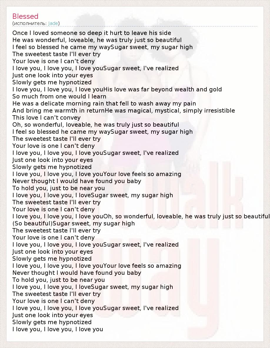 Once I loved someone so deep it hurt to leave his side He was wonderful, loveable, he was truly just so beautiful I feel so blessed he came my waySugar sweet, my sugar high The sweetest taste I'll ever try Your love is one I can't deny I love you, I love you, I love youSugar sweet, I've realized Just one look into your eyes Slowly gets me hypnotized I love you, I love you, I love youHis love was far beyond wealth and gold So much from one would I learn He was a delicate morning rain that fell to wash away my pain And bring me warmth in returnHe was magical, mystical, simply irresistible This love I can't convey Oh, so wonderful, loveable, he was truly just so beautiful I feel so blessed he came my waySugar sweet, my sugar high The sweetest taste I'll ever try Your love is one I can't deny I love you, I love you, I love youSugar sweet, I've realized Just one look into your eyes Slowly gets me hypnotized I love you, I love you, I love youYour love feels so amazing Never thought I would have found you baby To hold you, just to be near you I love you, I love you, I loveSugar sweet, my sugar high The sweetest taste I'll ever try Your love is one I can't deny I love you, I love you, I love youOh, so wonderful, loveable, he was truly just so beautiful (So beautiful)Sugar sweet, my sugar high The sweetest taste I'll ever try Your love is one I can't deny I love you, I love you, I love youSugar sweet, I've realized Just one look into your eyes Slowly gets me hypnotized I love you, I love you, I love youYour love feels so amazing Never thought I would have found you baby To hold you, just to be near you I love you, I love you, I loveSugar sweet, my sugar high The sweetest taste I'll ever try Your love is one I can't deny I love you, I love you, I love youSugar sweet, I've realized Just one look into your eyes Slowly gets me hypnotized I love you, I love you, I love you