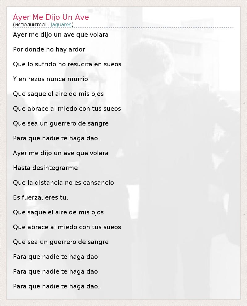 Ayer me dijo un ave que volara Por donde no hay ardor Que lo sufrido no resucita en sueos Y en rezos nunca murrio. Que saque el aire de mis ojos Que abrace al miedo con tus sueos Que sea un guerrero de sangre Para que nadie te haga dao. Ayer me dijo un ave que volara Hasta desintegrarme Que la distancia no es cansancio Es fuerza, eres tu. Que saque el aire de mis ojos Que abrace al miedo con tus sueos Que sea un guerrero de sangre Para que nadie te haga dao Para que nadie te haga dao Para que nadie te haga dao.