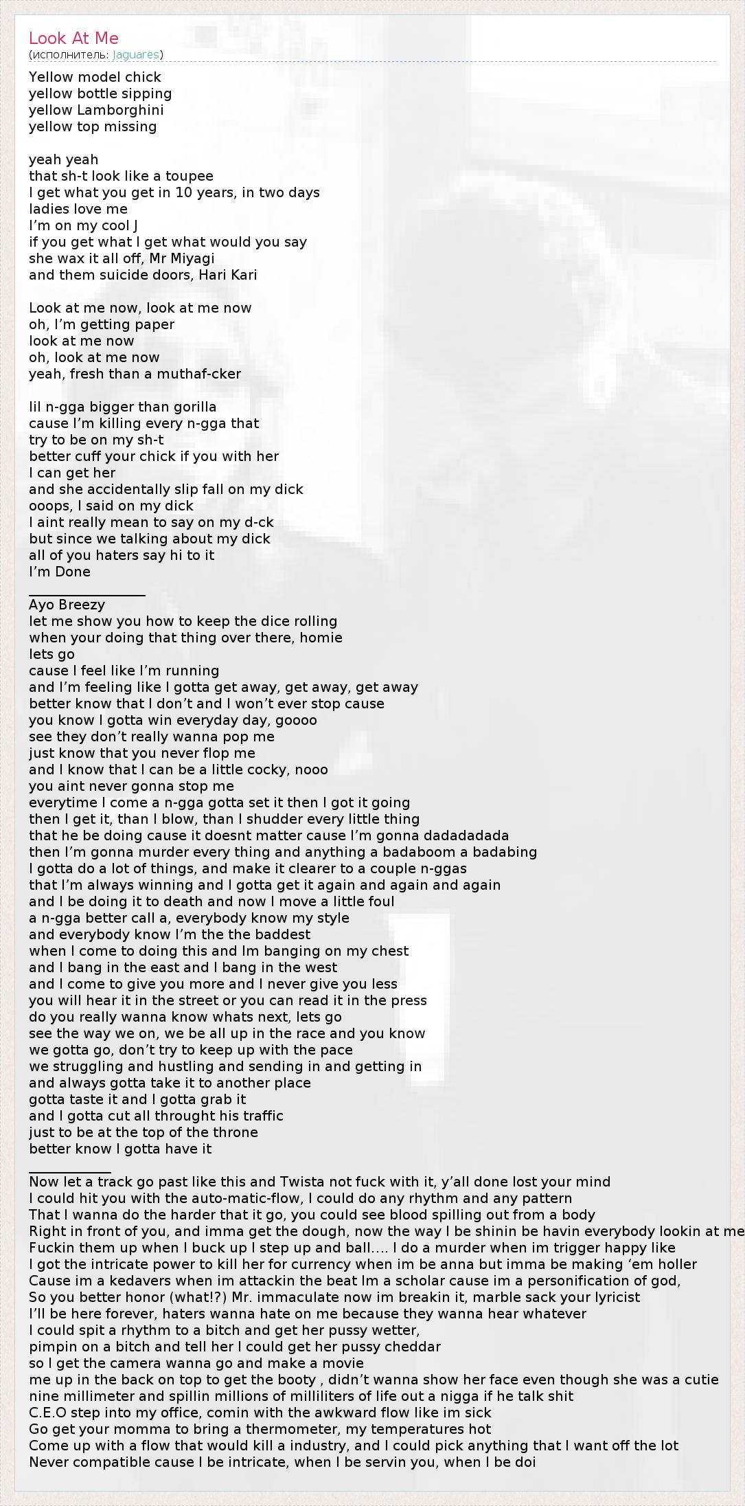 Yellow model chick yellow bottle sipping yellow Lamborghini yellow top missing yeah yeah that sh-t look like a toupee I get what you get in 10 years, in two days ladies love me I’m on my cool J if you get what I get what would you say she wax it all off, Mr Miyagi and them suicide doors, Hari Kari Look at me now, look at me now oh, I’m getting paper look at me now oh, look at me now yeah, fresh than a muthaf-cker lil n-gga bigger than gorilla cause I’m killing every n-gga that try to be on my sh-t better cuff your chick if you with her I can get her and she accidentally slip fall on my dick ooops, I said on my dick I aint really mean to say on my d-ck but since we talking about my dick all of you haters say hi to it I’m Done _________________ Ayo Breezy let me show you how to keep the dice rolling when your doing that thing over there, homie lets go cause I feel like I’m running and I’m feeling like I gotta get away, get away, get away better know that I don’t and I won’t ever stop cause you know I gotta win everyday day, goooo see they don’t really wanna pop me just know that you never flop me and I know that I can be a little cocky, nooo you aint never gonna stop me everytime I come a n-gga gotta set it then I got it going then I get it, than I blow, than I shudder every little thing that he be doing cause it doesnt matter cause I’m gonna dadadadada then I’m gonna murder every thing and anything a badaboom a badabing I gotta do a lot of things, and make it clearer to a couple n-ggas that I’m always winning and I gotta get it again and again and again and I be doing it to death and now I move a little foul a n-gga better call a, everybody know my style and everybody know I’m the the baddest when I come to doing this and Im banging on my chest and I bang in the east and I bang in the west and I come to give you more and I never give you less you will hear it in the street or you can read it in the press do you really wanna know whats next, lets go see the way we on, we be all up in the race and you know we gotta go, don’t try to keep up with the pace we struggling and hustling and sending in and getting in and always gotta take it to another place gotta taste it and I gotta grab it and I gotta cut all throught his traffic just to be at the top of the throne better know I gotta have it ____________ Now let a track go past like this and Twista not fuck with it, y’all done lost your mind I could hit you with the auto-matic-flow, I could do any rhythm and any pattern That I wanna do the harder that it go, you could see blood spilling out from a body Right in front of you, and imma get the dough, now the way I be shinin be havin everybody lookin at me Fuckin them up when I buck up I step up and ball…. I do a murder when im trigger happy like I got the intricate power to kill her for currency when im be anna but imma be making ‘em holler Cause im a kedavers when im attackin the beat Im a scholar cause im a personification of god, So you better honor (what!?) Mr. immaculate now im breakin it, marble sack your lyricist I’ll be here forever, haters wanna hate on me because they wanna hear whatever I could spit a rhythm to a bitch and get her pussy wetter, pimpin on a bitch and tell her I could get her pussy cheddar so I get the camera wanna go and make a movie me up in the back on top to get the booty , didn’t wanna show her face even though she was a cutie nine millimeter and spillin millions of milliliters of life out a nigga if he talk shit C.E.O step into my office, comin with the awkward flow like im sick Go get your momma to bring a thermometer, my temperatures hot Come up with a flow that would kill a industry, and I could pick anything that I want off the lot Never compatible cause I be intricate, when I be servin you, when I be doi
